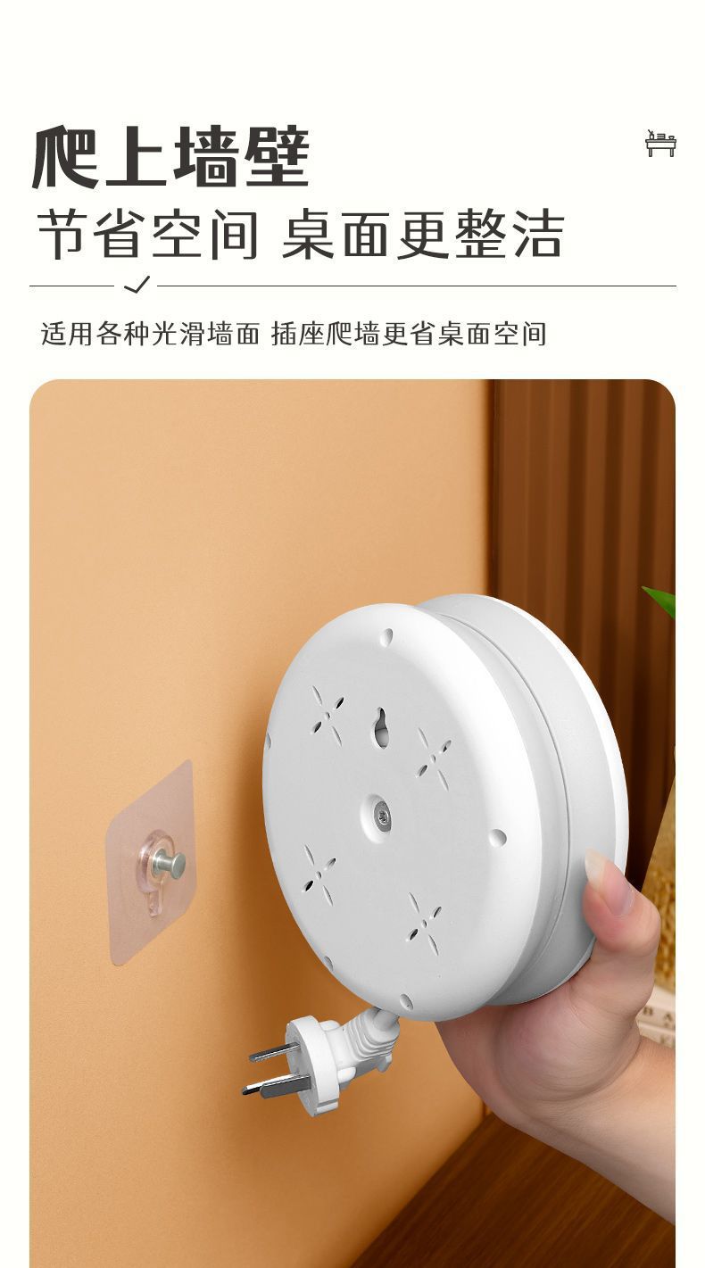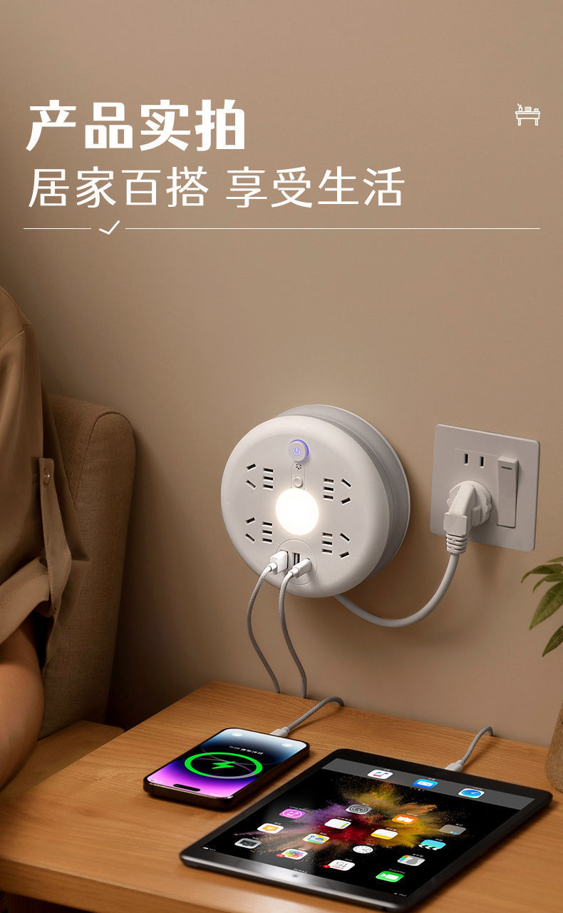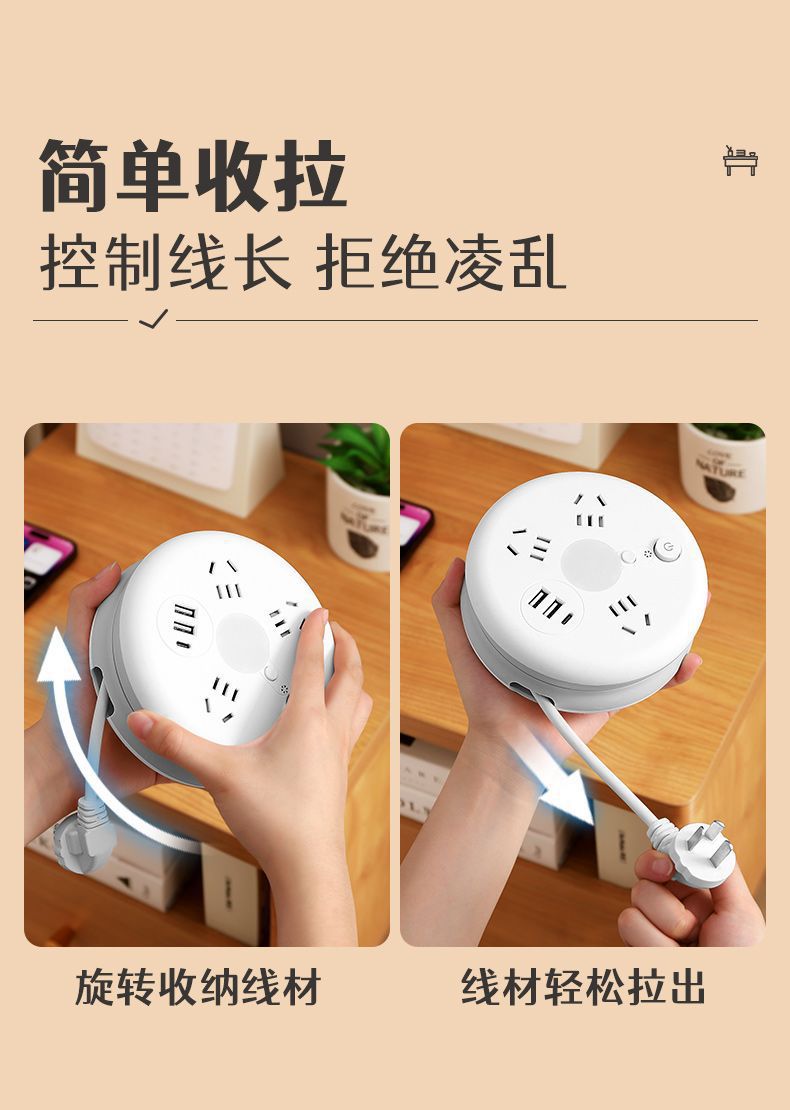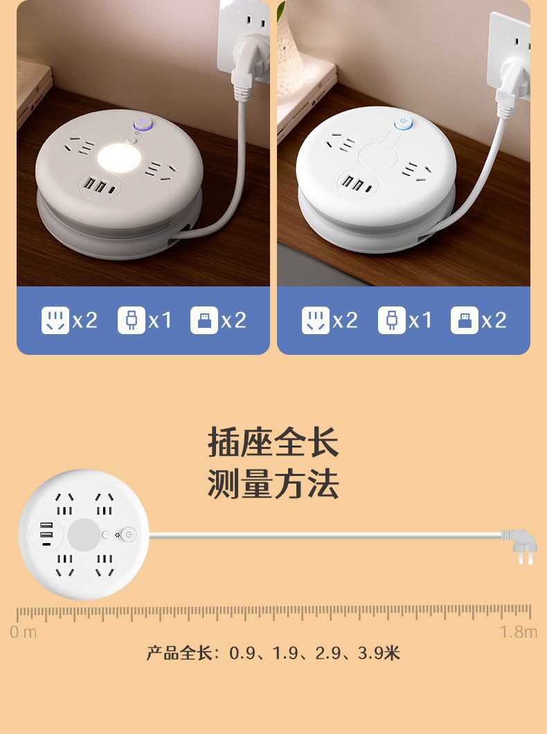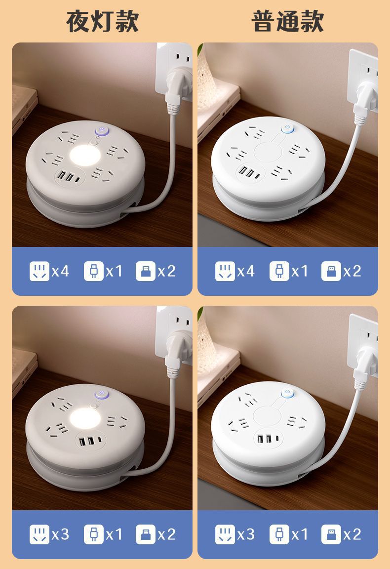 圆形可收纳伸缩排插usb接线板家用宿舍转换器插座带夜灯排插线板