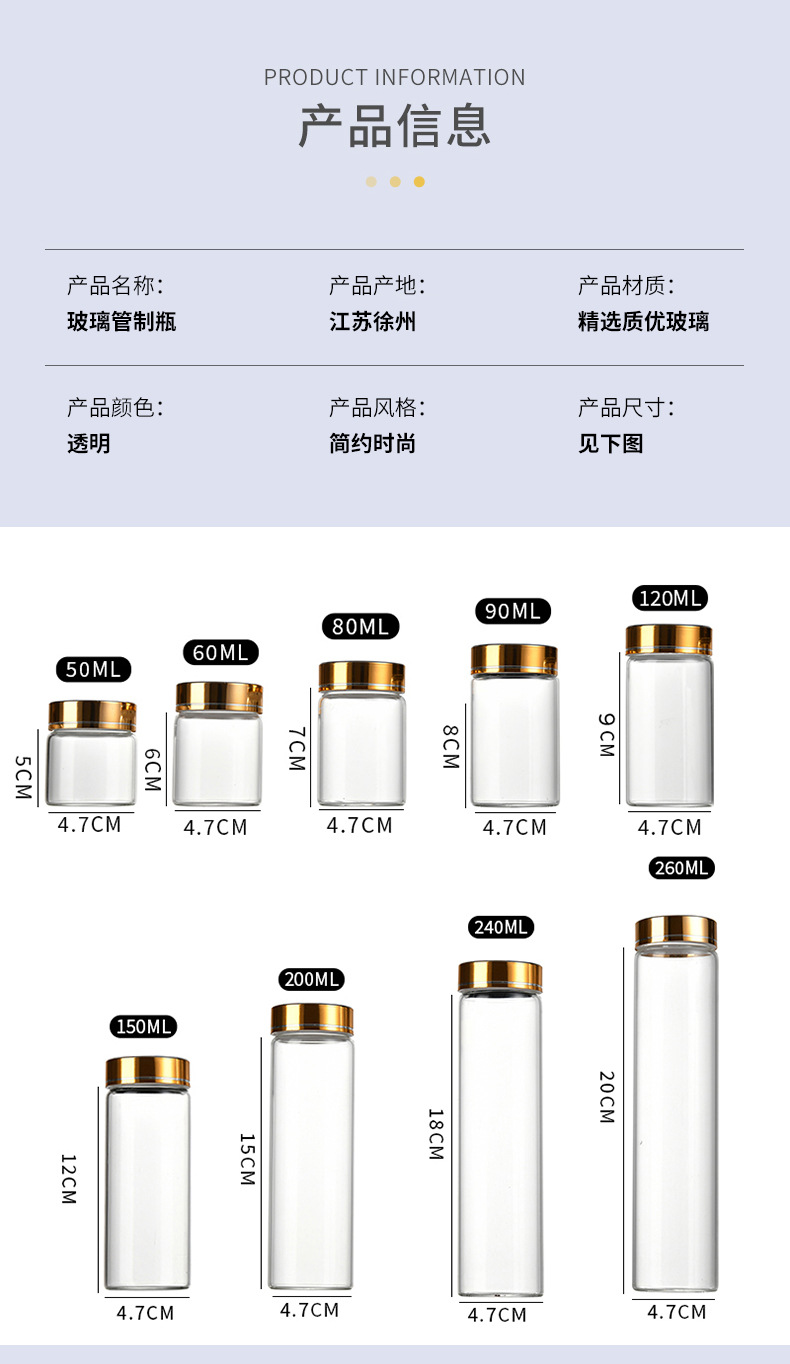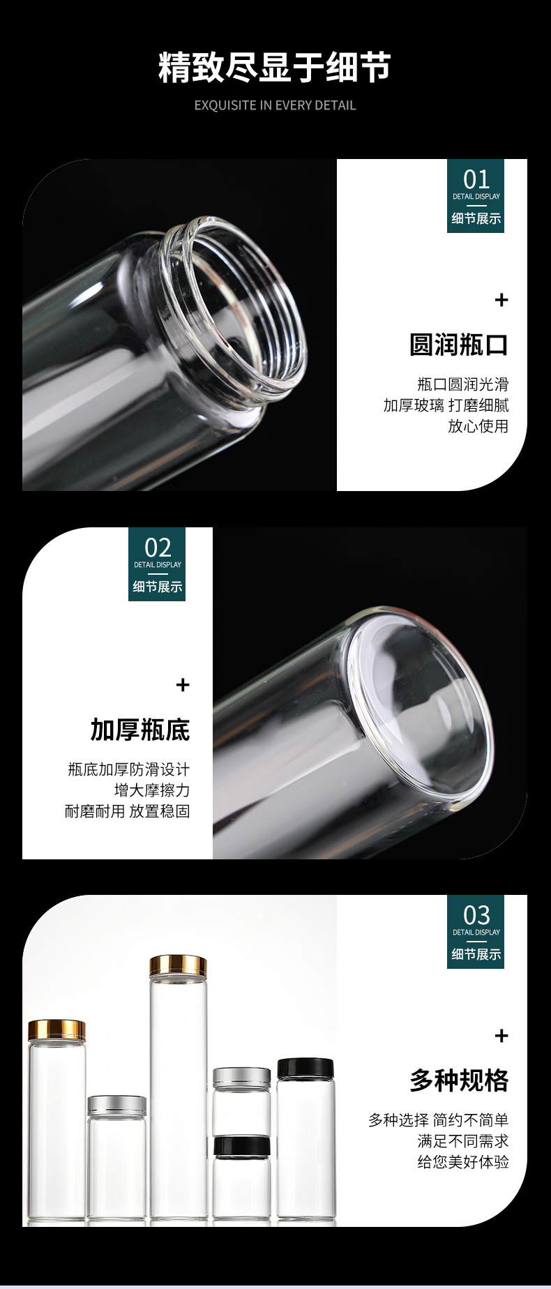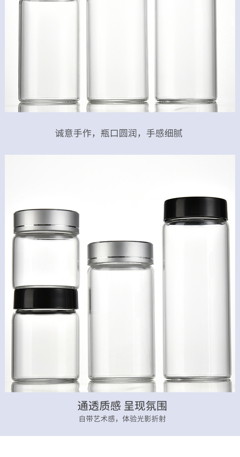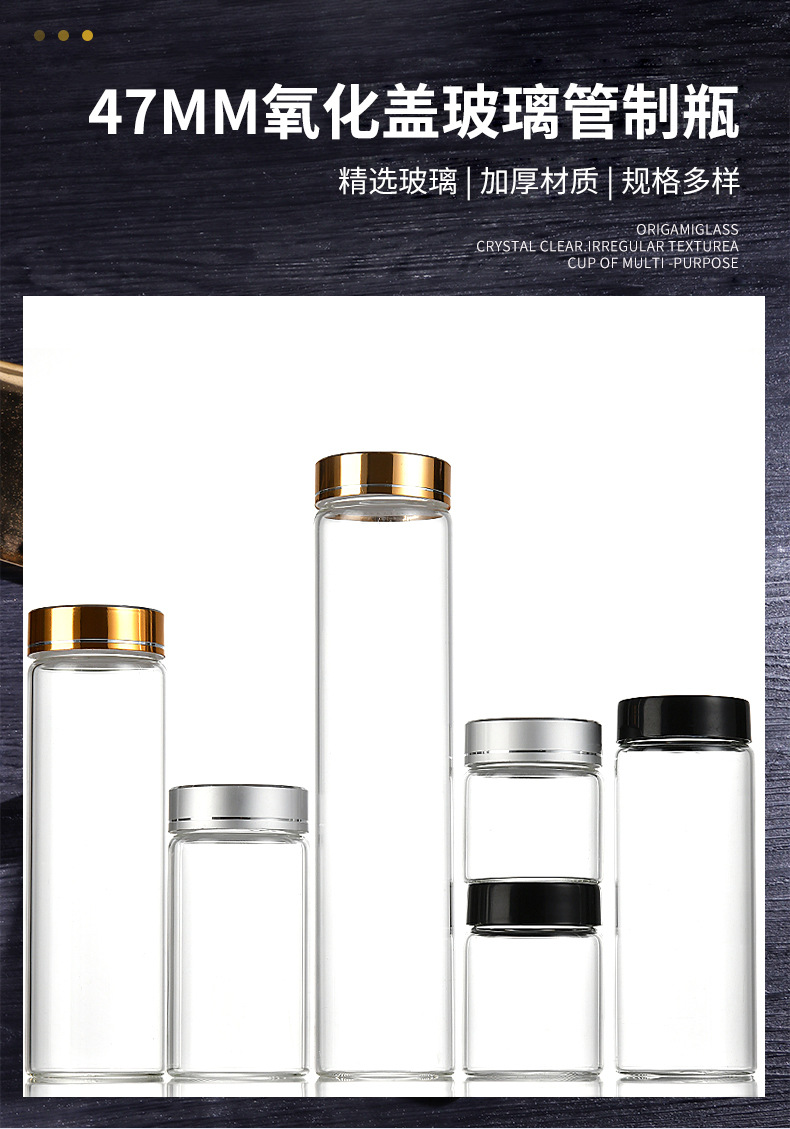 47mmガラス管瓶、ネジ口アルミ酸化物蓋、冬虫夏草・沈香瓶、小薬瓶、キャンディー瓶、ネジ口密封瓶