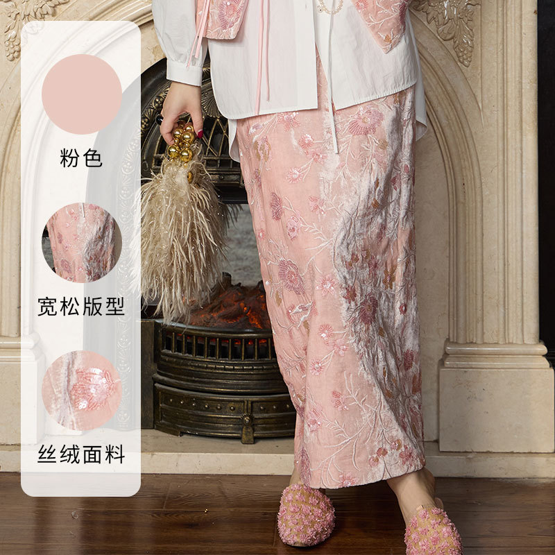 新中式婦人服 ピンクベルベットスカート スパンコール刺繍 立体刺繍スカート 多用途 ヒップスカート 高級