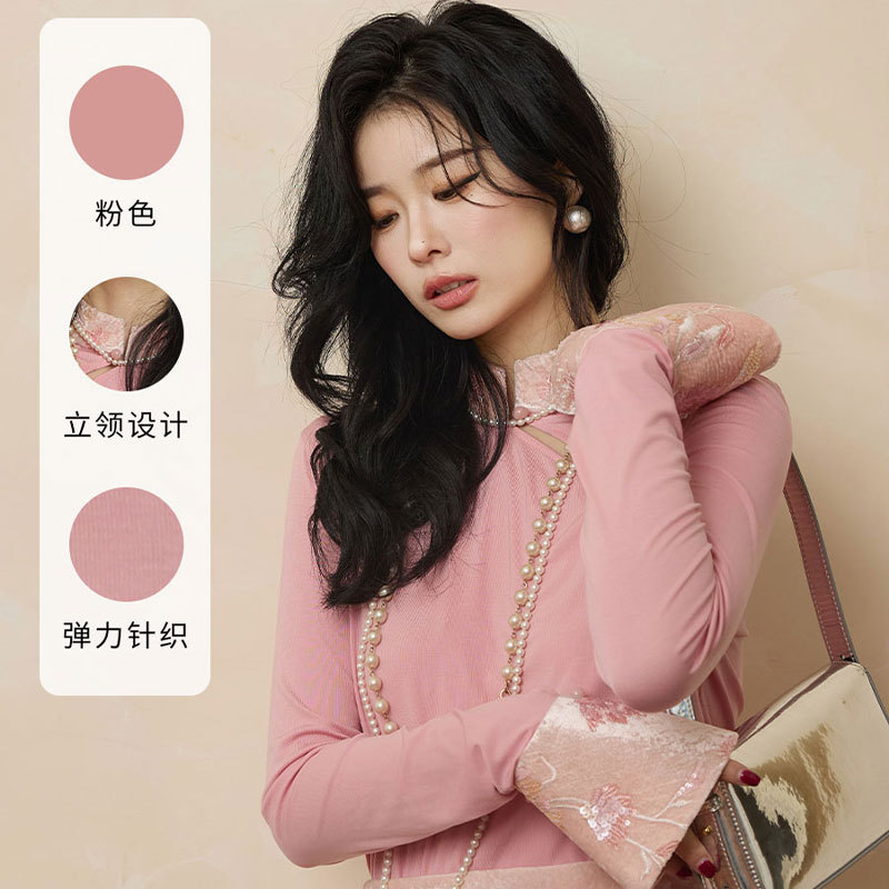 新しい中国式の婦人服のニットの底のシャツのピンクの若いタイプの長袖の頭の上着の立襟の百合の修身のシャツ