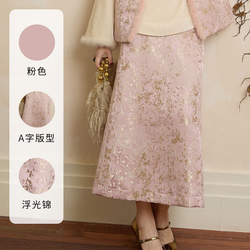 新中式ピンクスカートA版秋冬万能ミディ丈スカート光沢ジャカードヒップスカート立体ジャカード