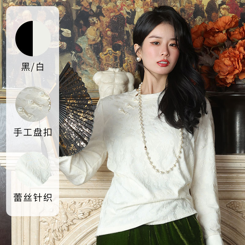 新中式無地万能高伸縮ニットトップス、レース立体浮き彫り花柄トップス、アーティスティックレトロスタイル
