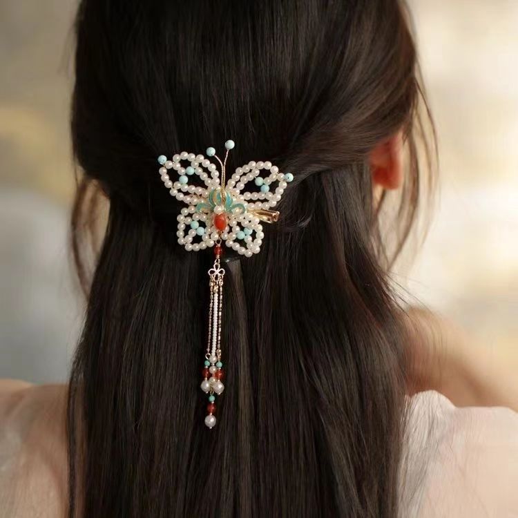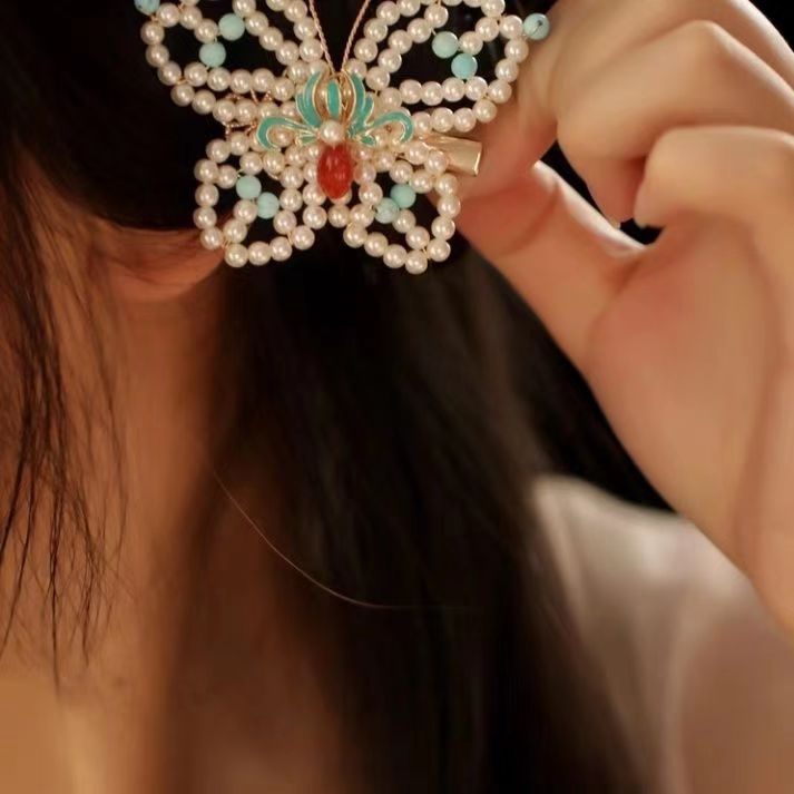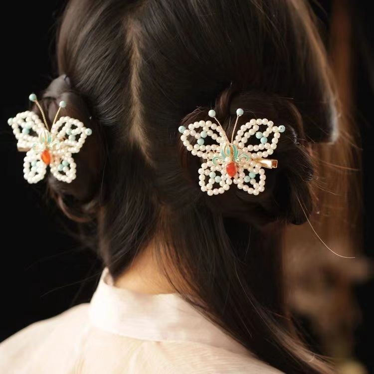 古風明清頭飾り蝶のヘアピンの縁に漢服のチャイナドレスを挟んで編集します。