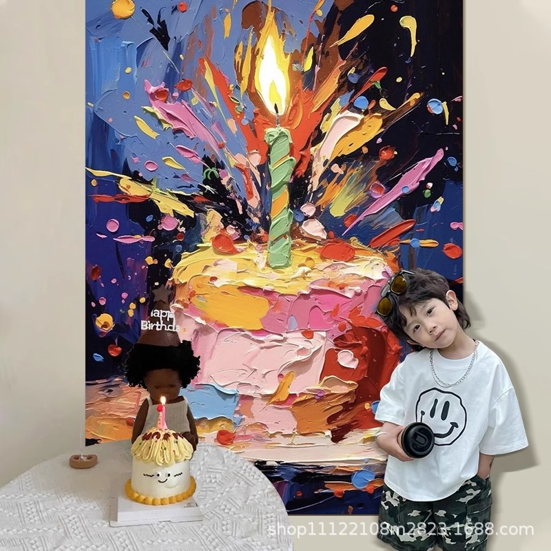 赤い本の油絵の誕生日ケーキの背景の布は男の子の女の子の赤ちゃんの誕生日のパーティーの装飾のシーンを掛けます。