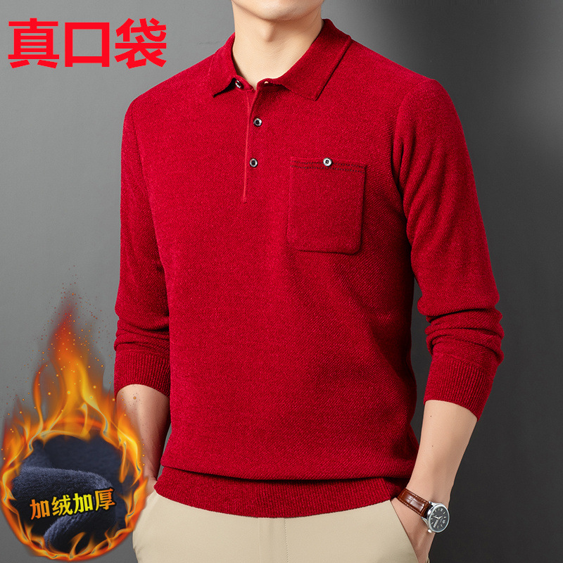 本命年の赤いセーターにベルベットをつけて男性poloシャツの襟を厚くした本物のポケットニットのシャツ冬のお父さん服