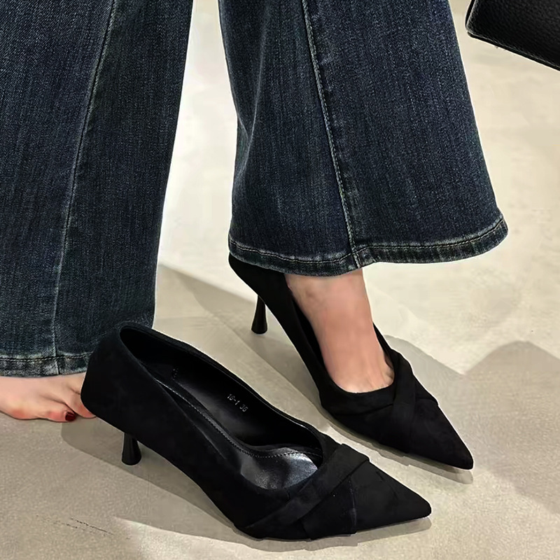 2025年新款尖头细跟高跟气质显瘦绒面浅口通勤女鞋中跟单鞋工作鞋