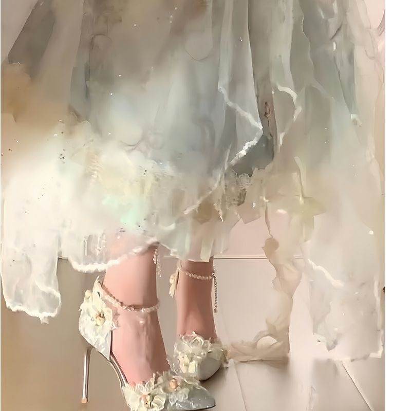 成人礼优雅气质尖头高跟鞋女珍珠链条单鞋花朵水晶婚鞋新娘鞋两穿