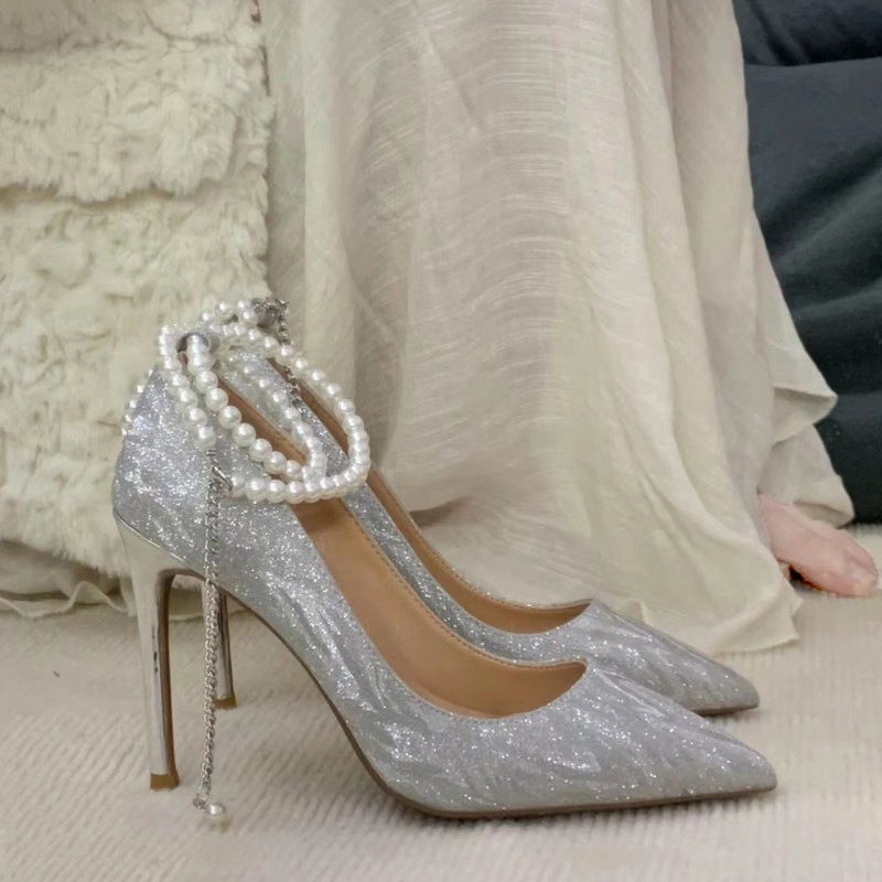 女性のためのハイヒール 2025 夏の新しいシルバーのパールチェーン美しい結婚式の靴ポインテッドトゥスティレットヒール浅い口のアウターシューズ