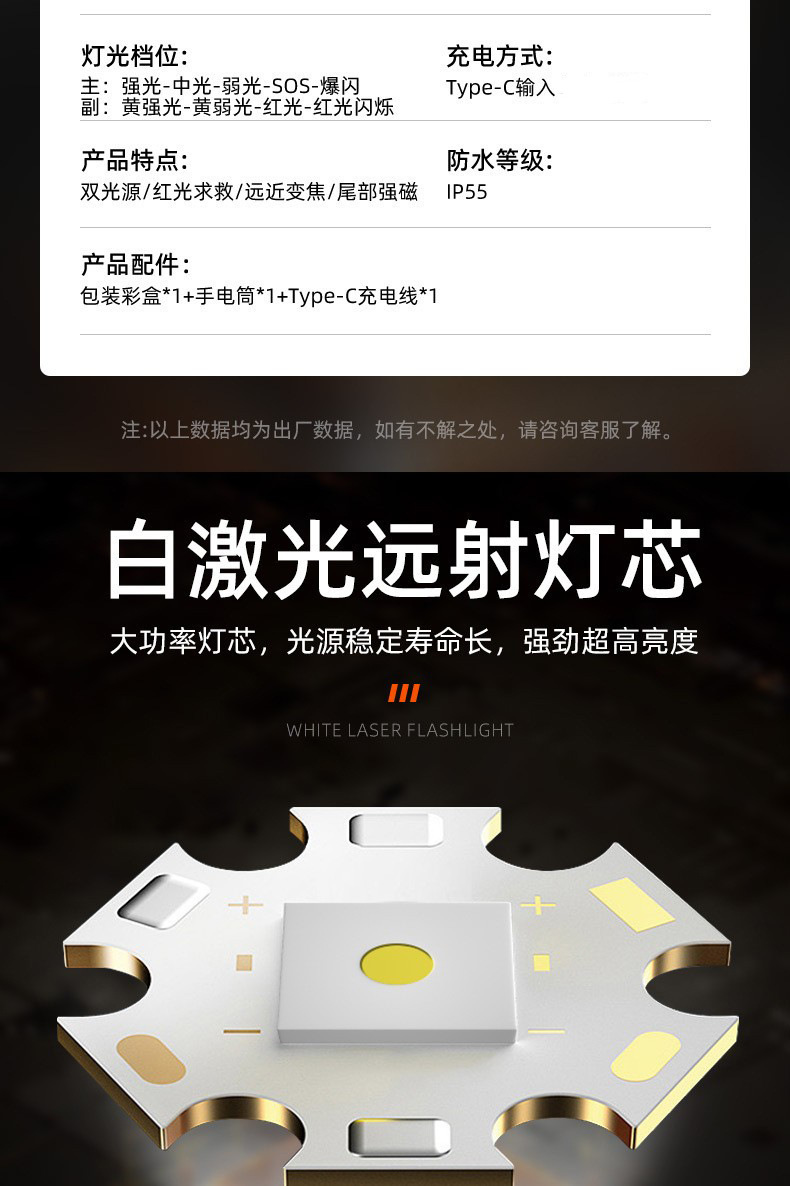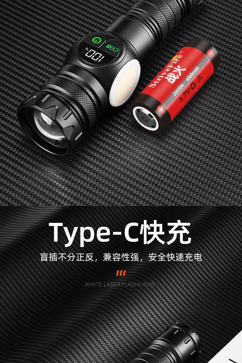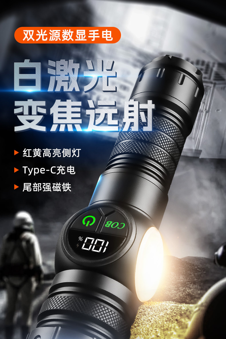 跨境白激光强光手电筒Type-C充电户外多功能数显强磁COB工作侧灯
