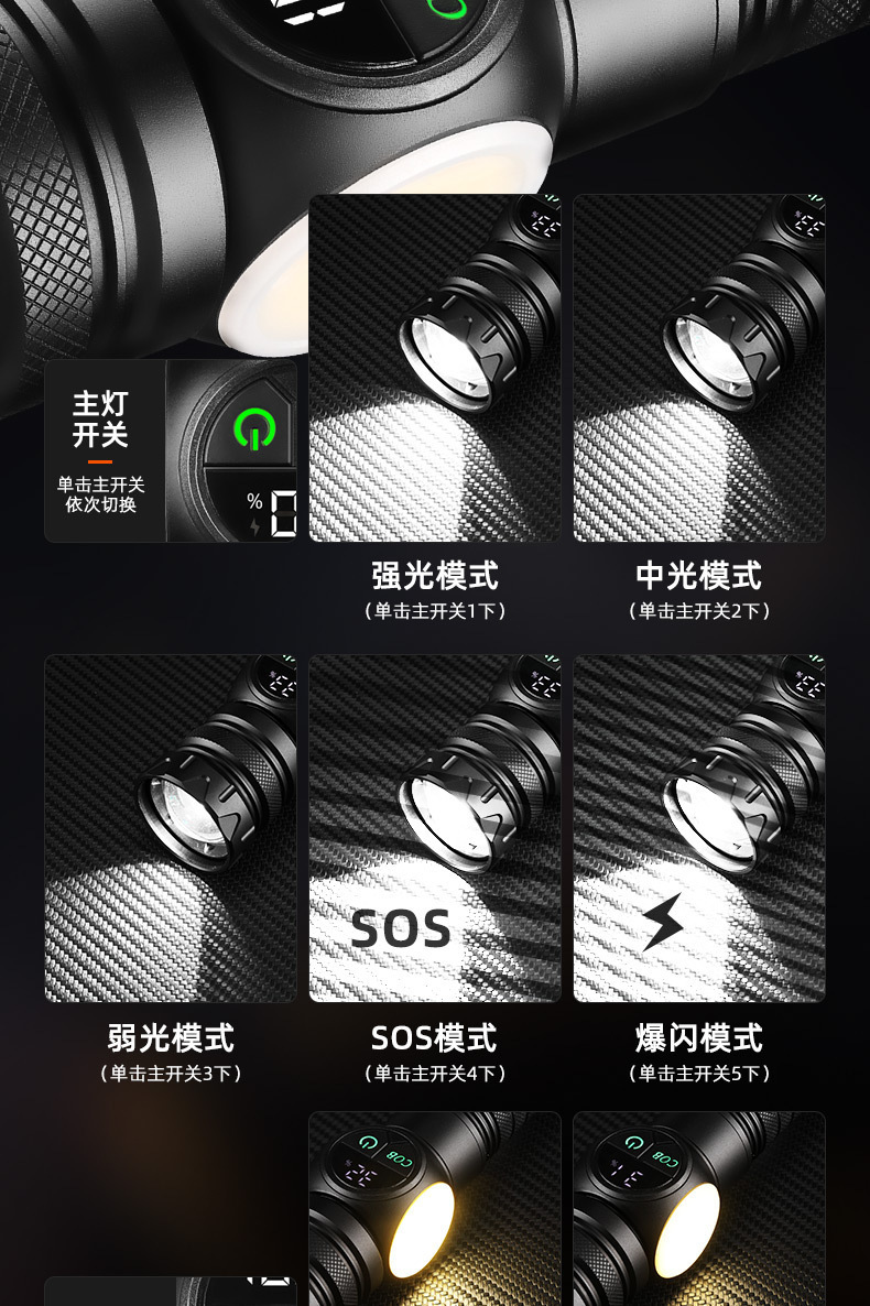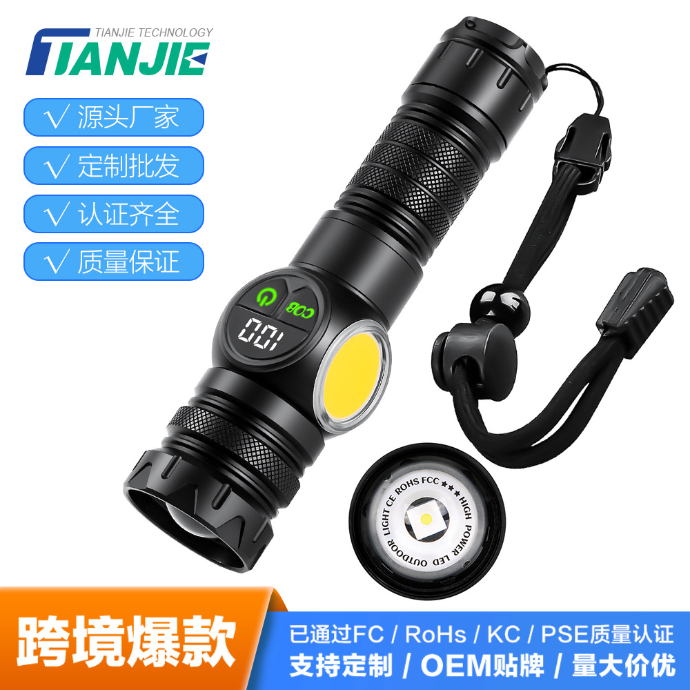 跨境户外手电筒多功能LED强光远射数显手电便携式尾部磁吸照明灯