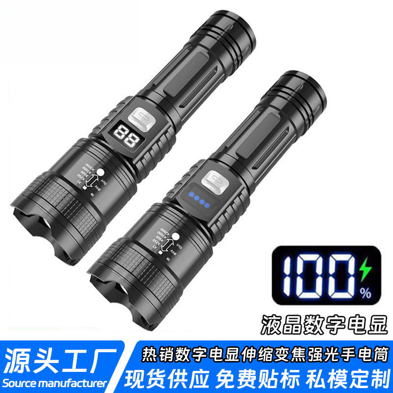 跨境多功能强光手电筒数字电显变焦应急电筒户外充电远射便携手电