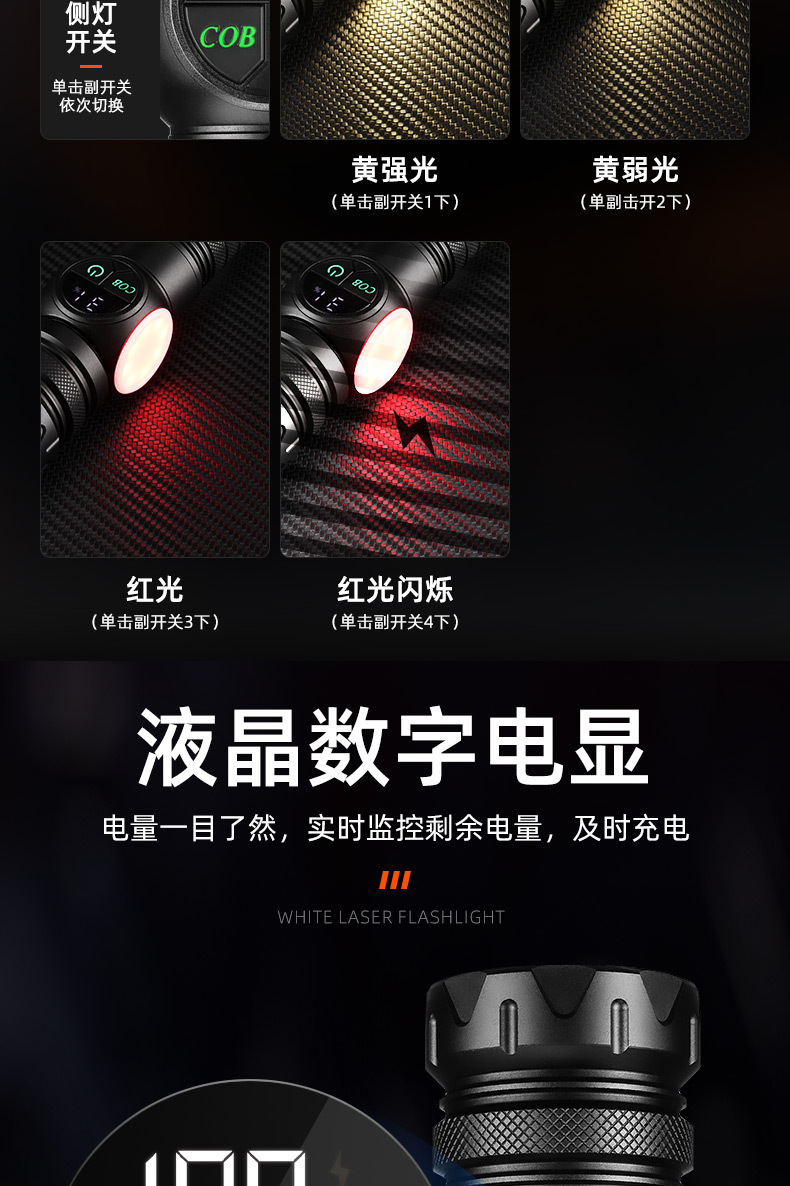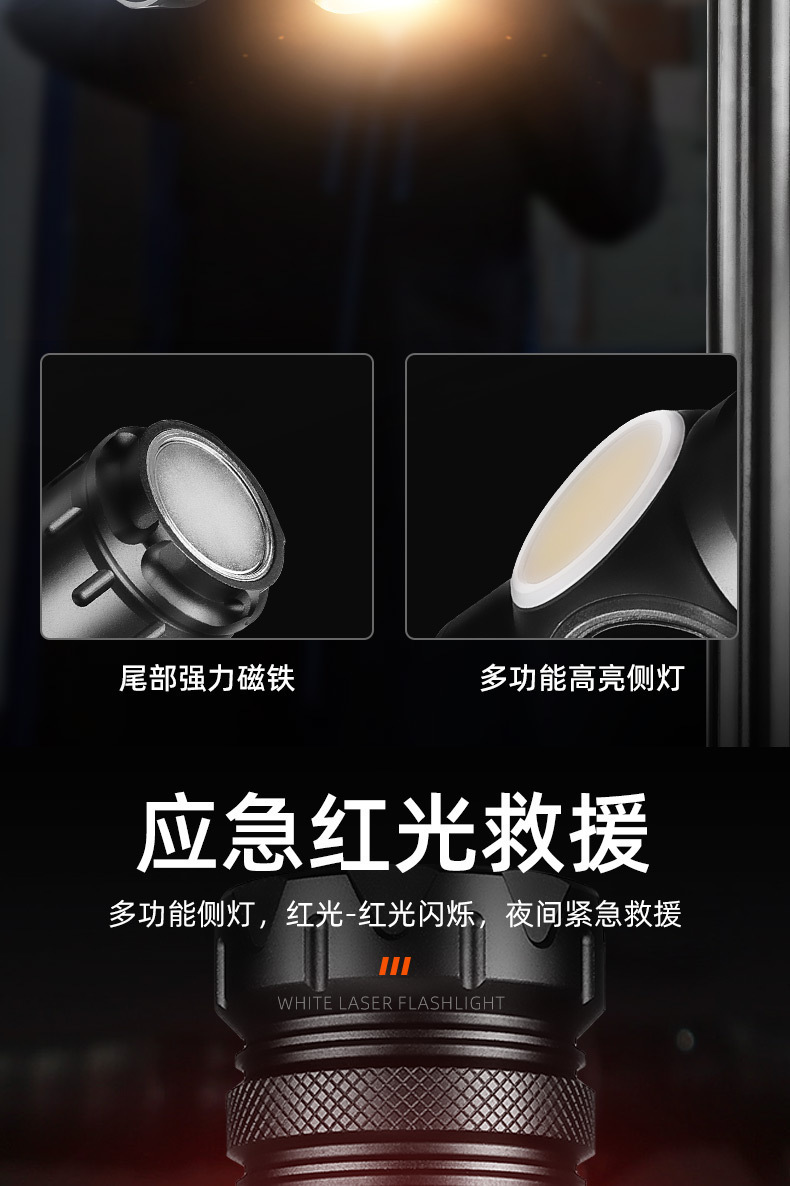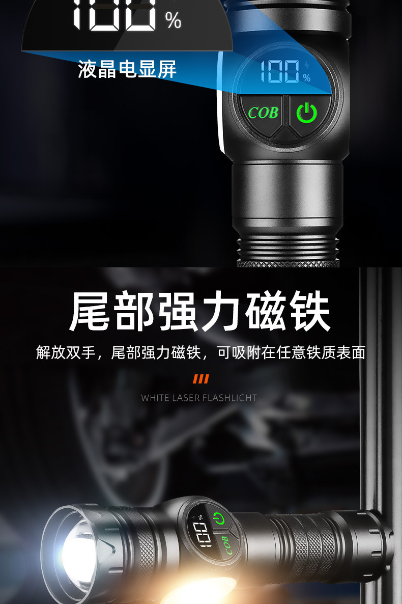 クロスボーダー白レーザー强い光の懐中电灯Type-C充电屋外多机能デジタル表示强い磁気COB働くサイドライト