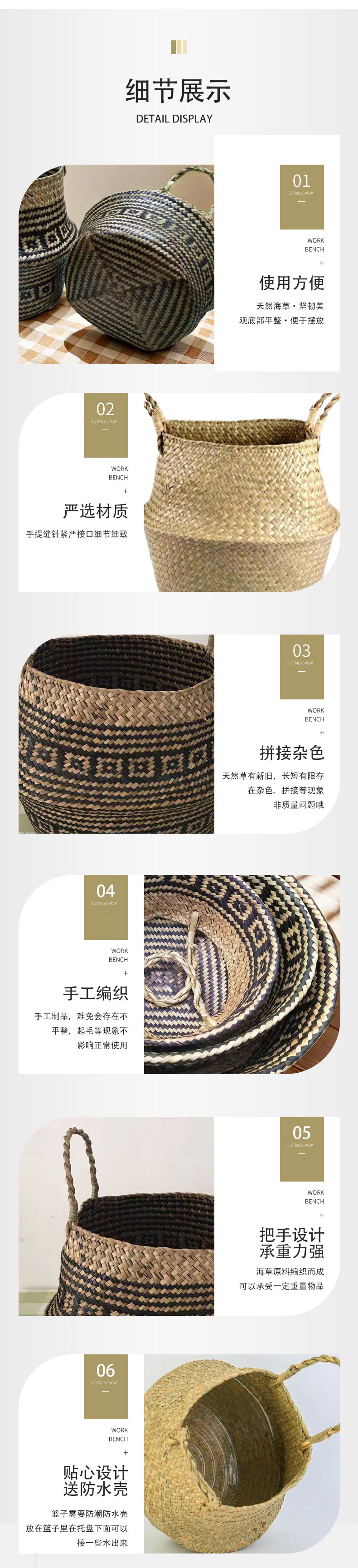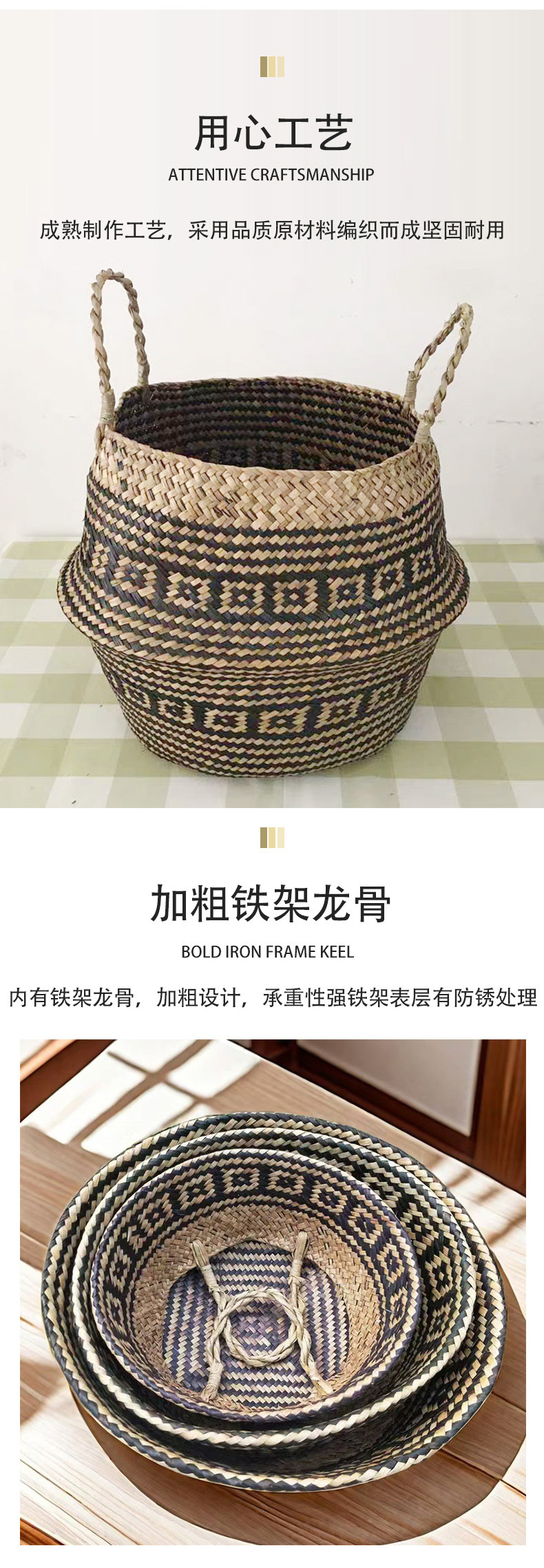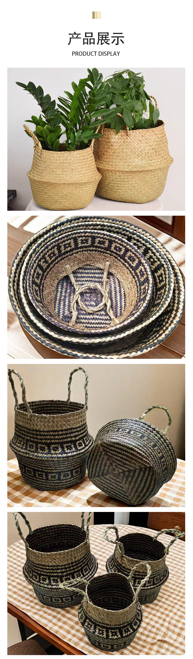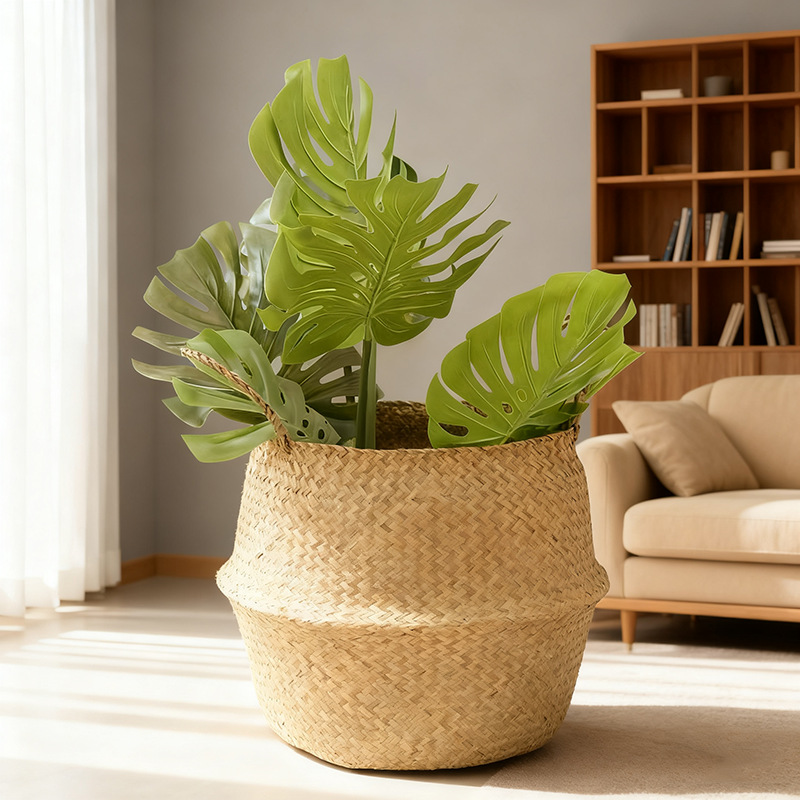 海草編み手提げかご 植物鉢 大容量折りたたみフラワーバスケット 手作り草編み家庭用品収納かご 卸売