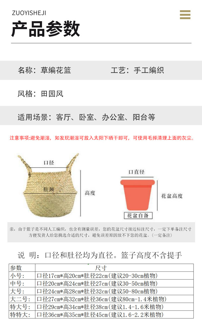 草编室内植物花篮手提编织篮绿植花盆装饰竹编盆栽落地折叠篮子