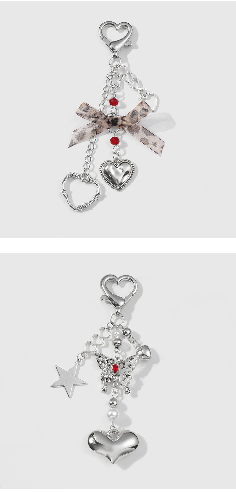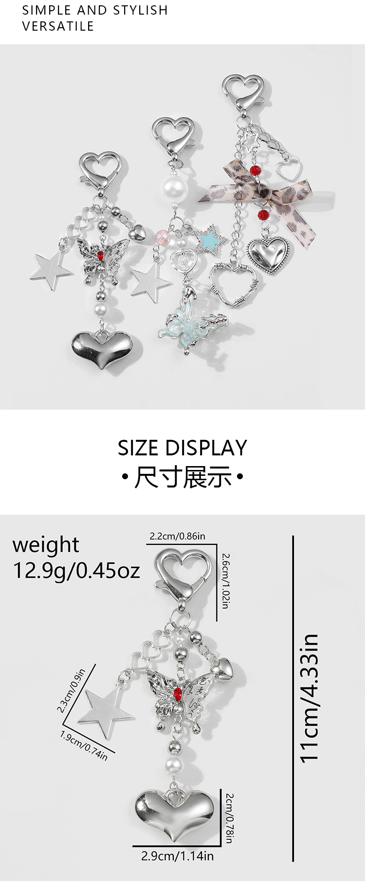 シルバー ラブ チェーン ヒョウ柄 リボン キーチェーン 1 個,シルバーラブチェーンレッドラインストーンバタフライキーホルダー1個,ホワイトパールブルーラインストーンスターバタフライキーホルダー1個