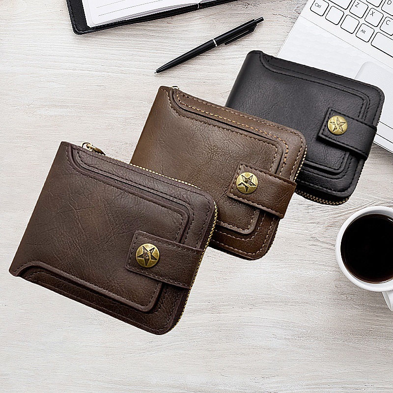 跨境新品2025复古男士短款钱包横款拉链多功能卡包三折搭扣零钱包