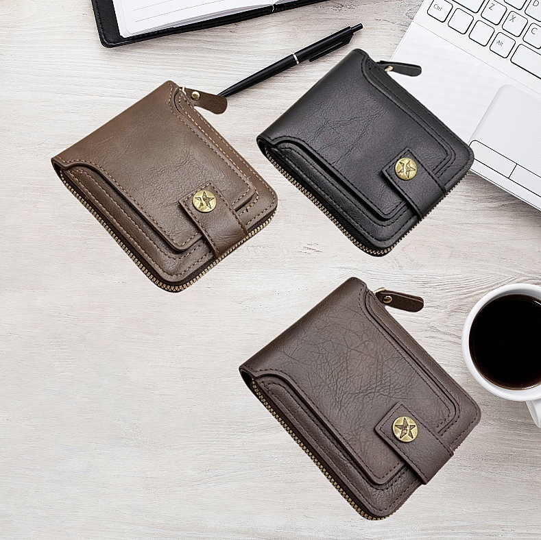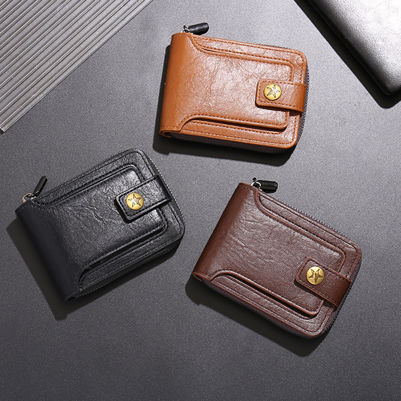クロスボーダー新商品2024レトロ男性ショート財布横型ファスナー多機能カードバッグ三つ折りファスナー小銭入れ