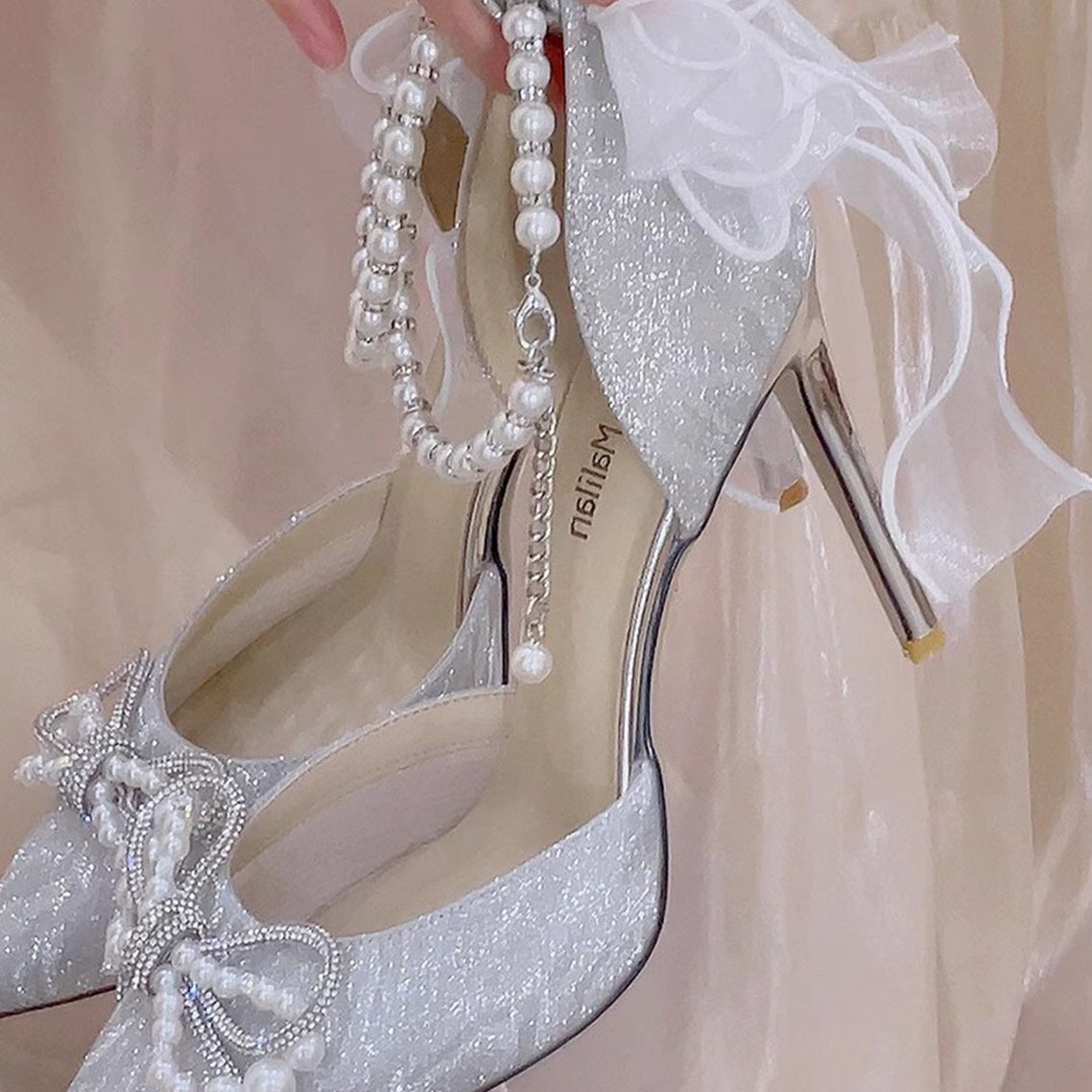 ハイヒール2024新型真珠蝶結び銀色中空サンダル18歳の成人式ウェディングドレスは花嫁靴を両方履いている