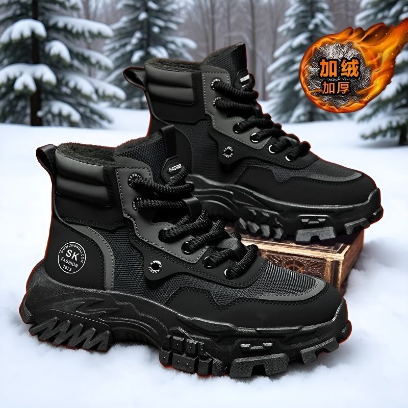黑色加绒加厚男鞋冬季户外雪地靴工装马丁靴厚底防寒保暖高帮棉鞋