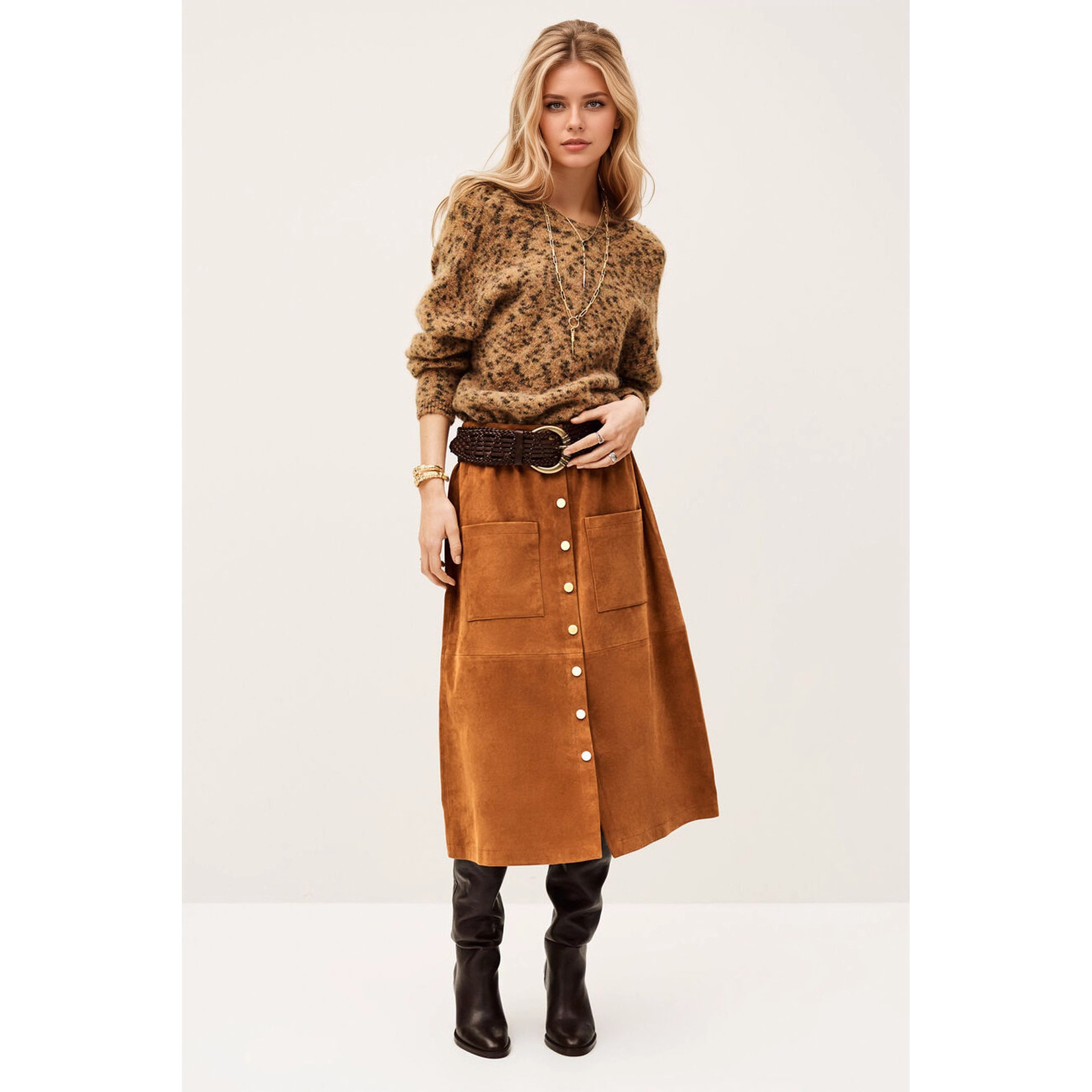 欧美跨境时尚麂皮绒半裙中长2025秋冬新款百搭高腰显瘦A字半身裙