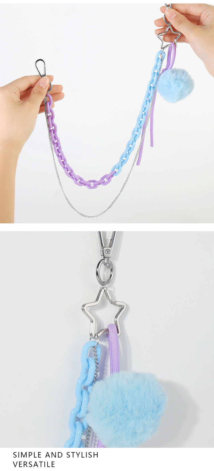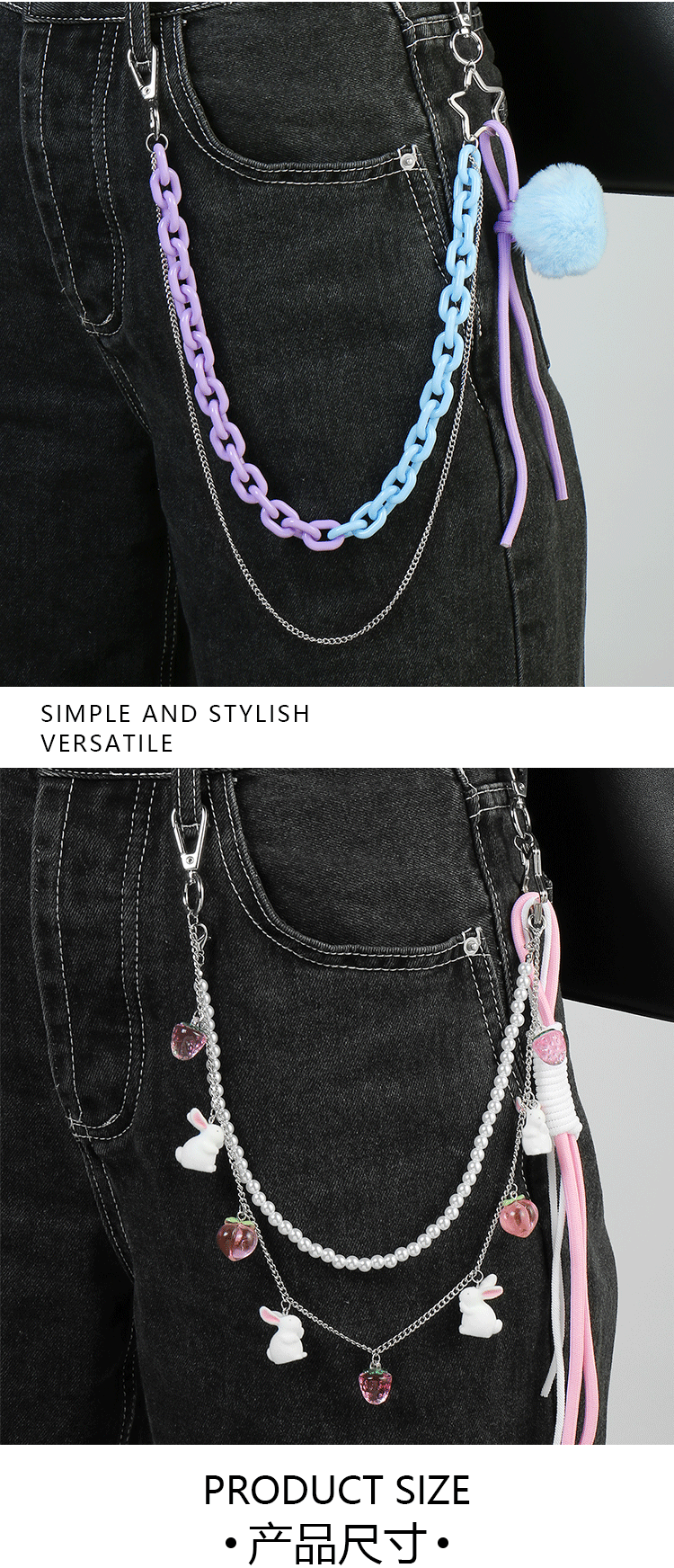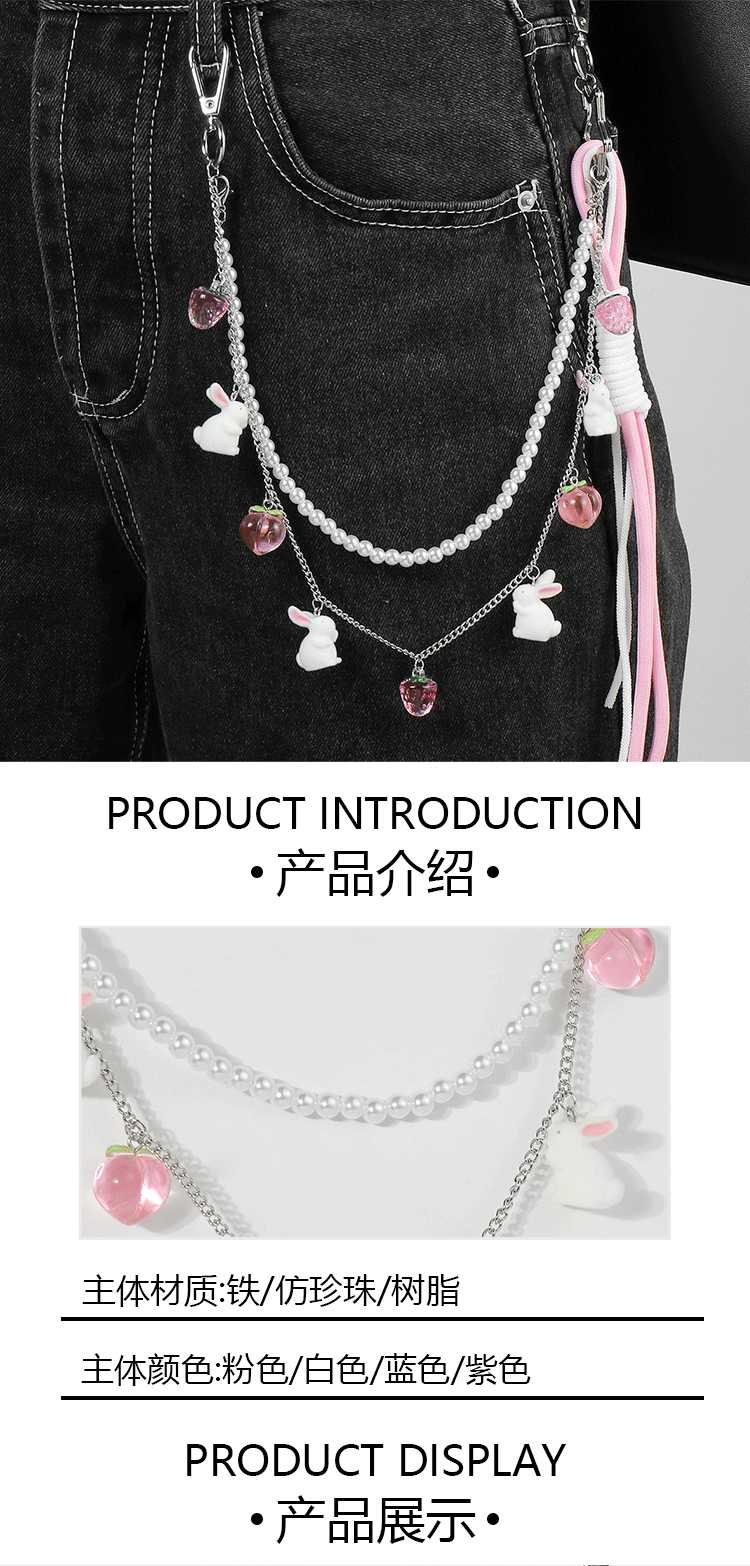 国境を越えた起爆ファッションは高颜値の青い毛玉玉アクリルチェーンが真珠ウサギの腰チェーンのズボンチェーンに似せている