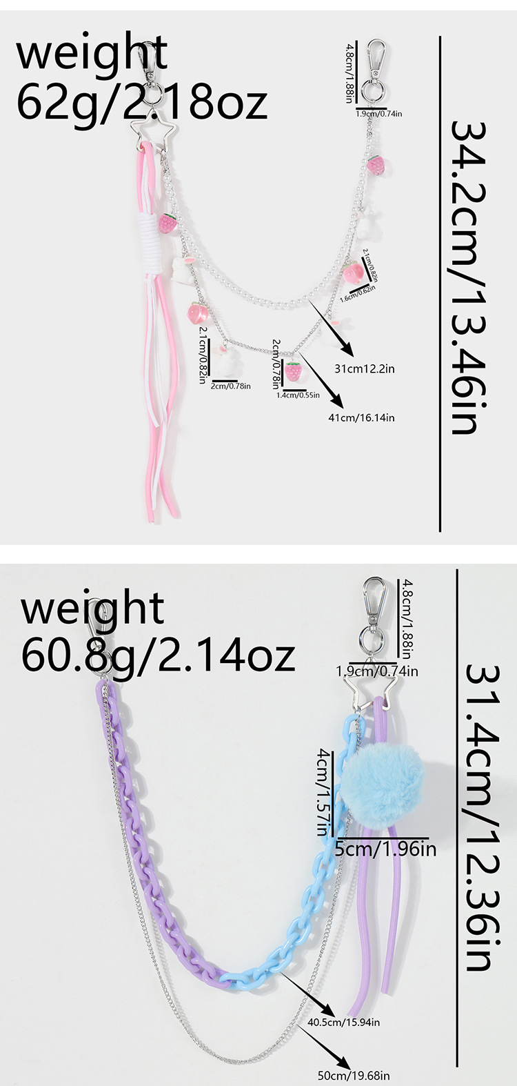 ブルーのファーボールアクリルパンツチェーン1本,ホワイトパールバニー ストロベリーピーチ パンツチェーン 1本