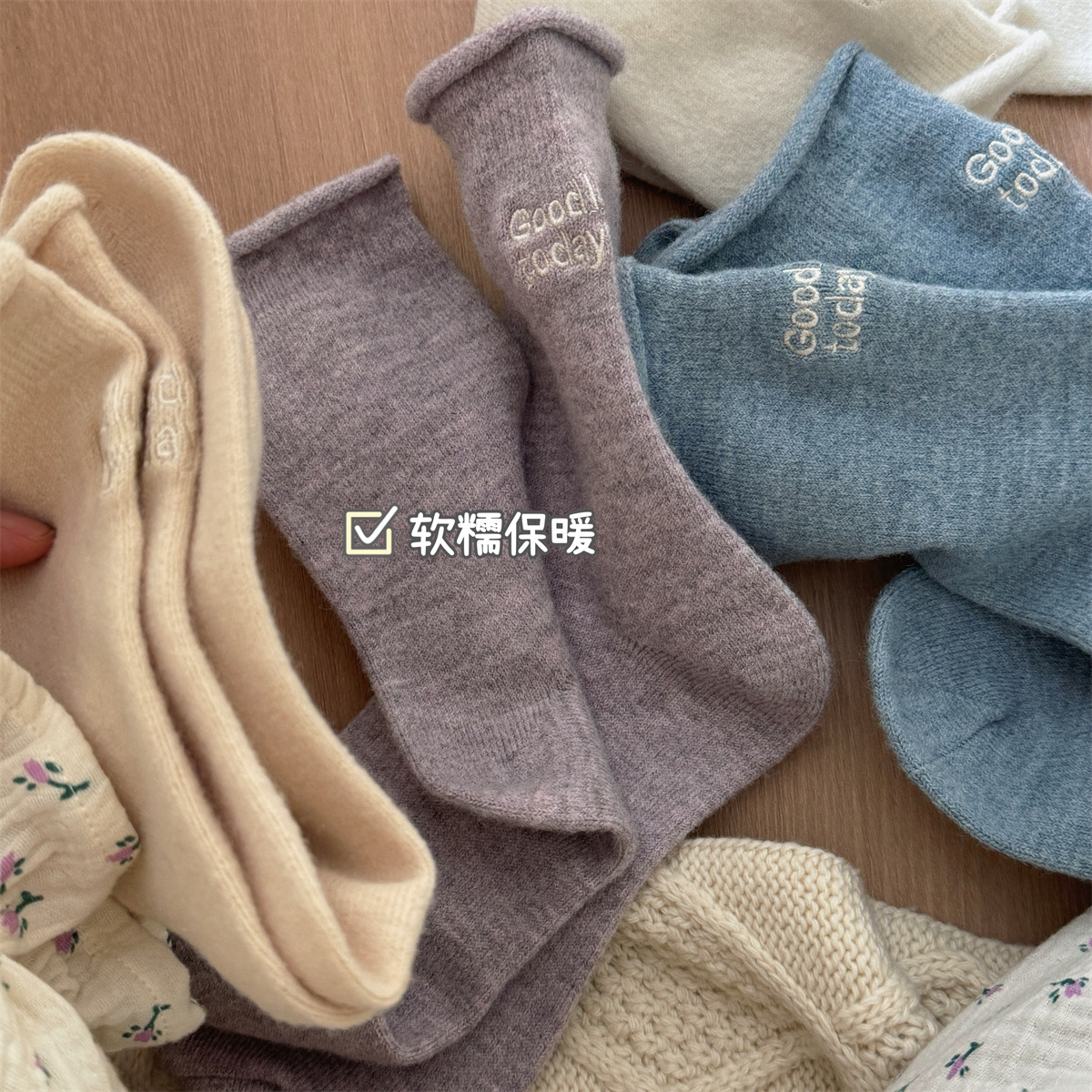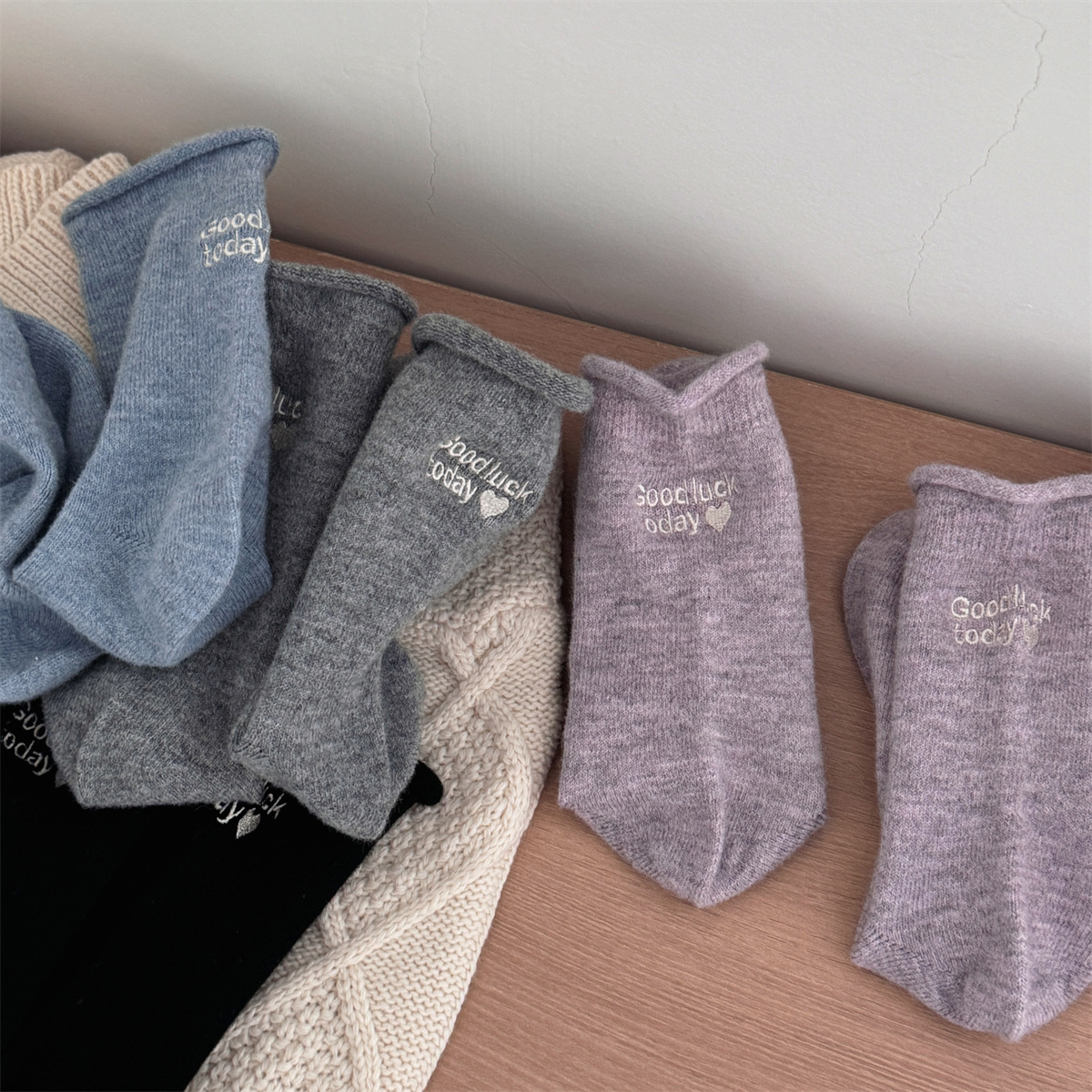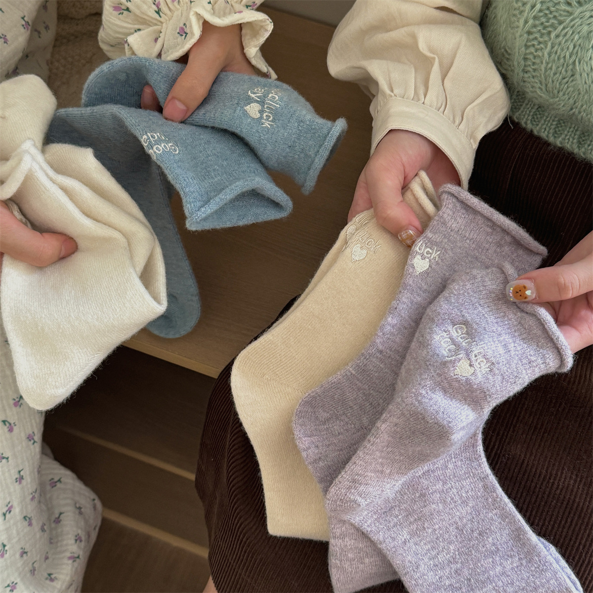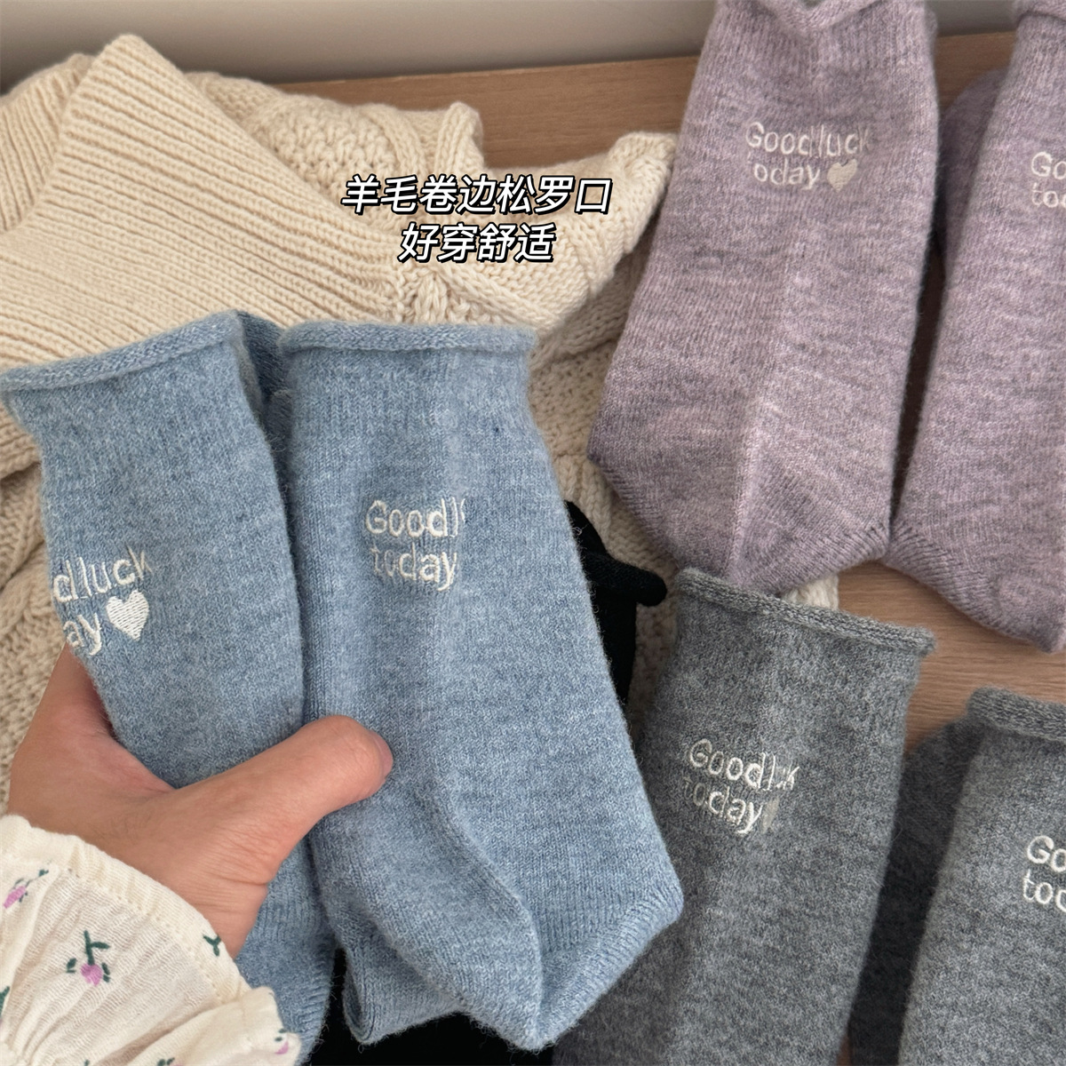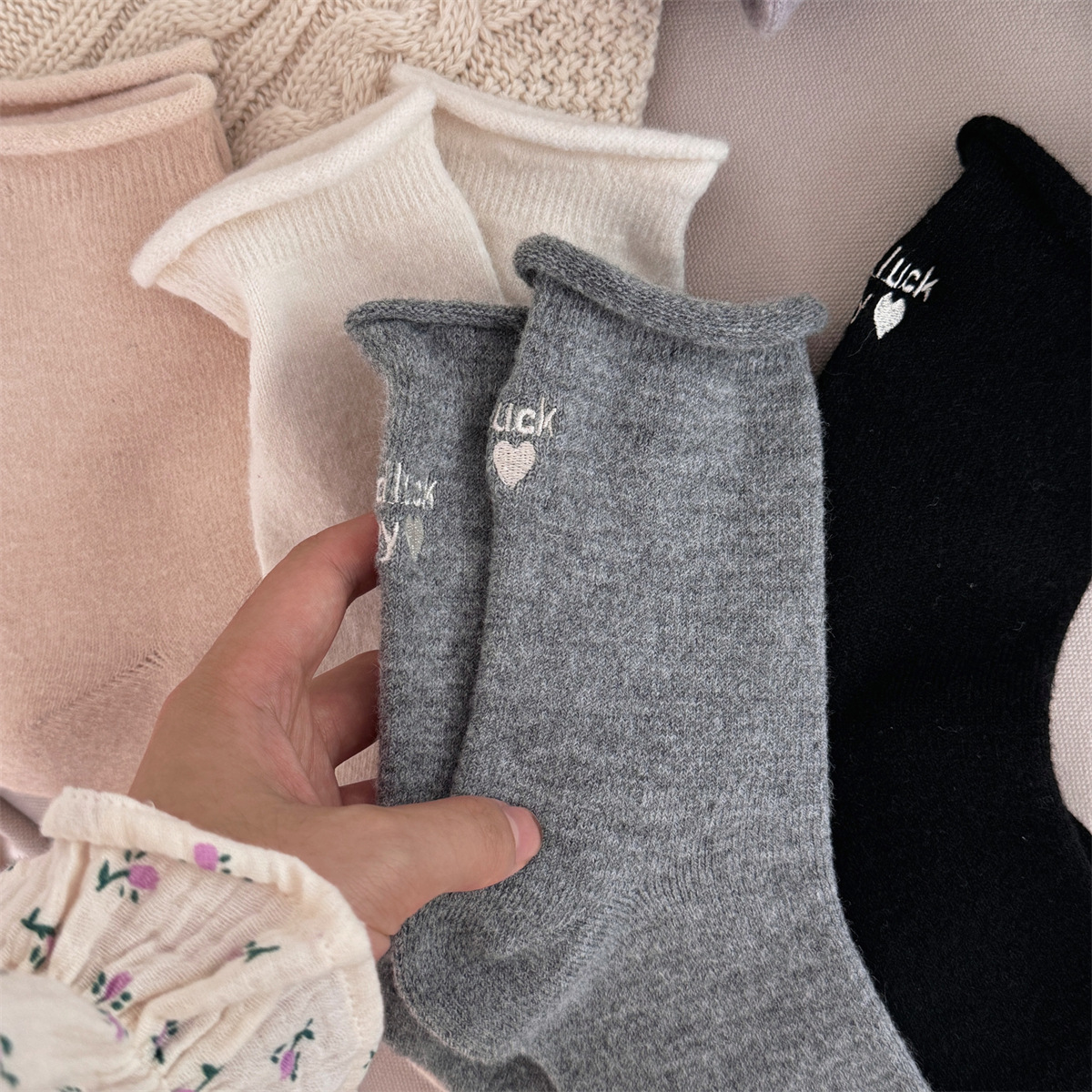 IOULOR新商品日系GOODLUCK巻き縁ウール靴下秋冬柔らかいモチモチ保温靴下諸及び靴下女