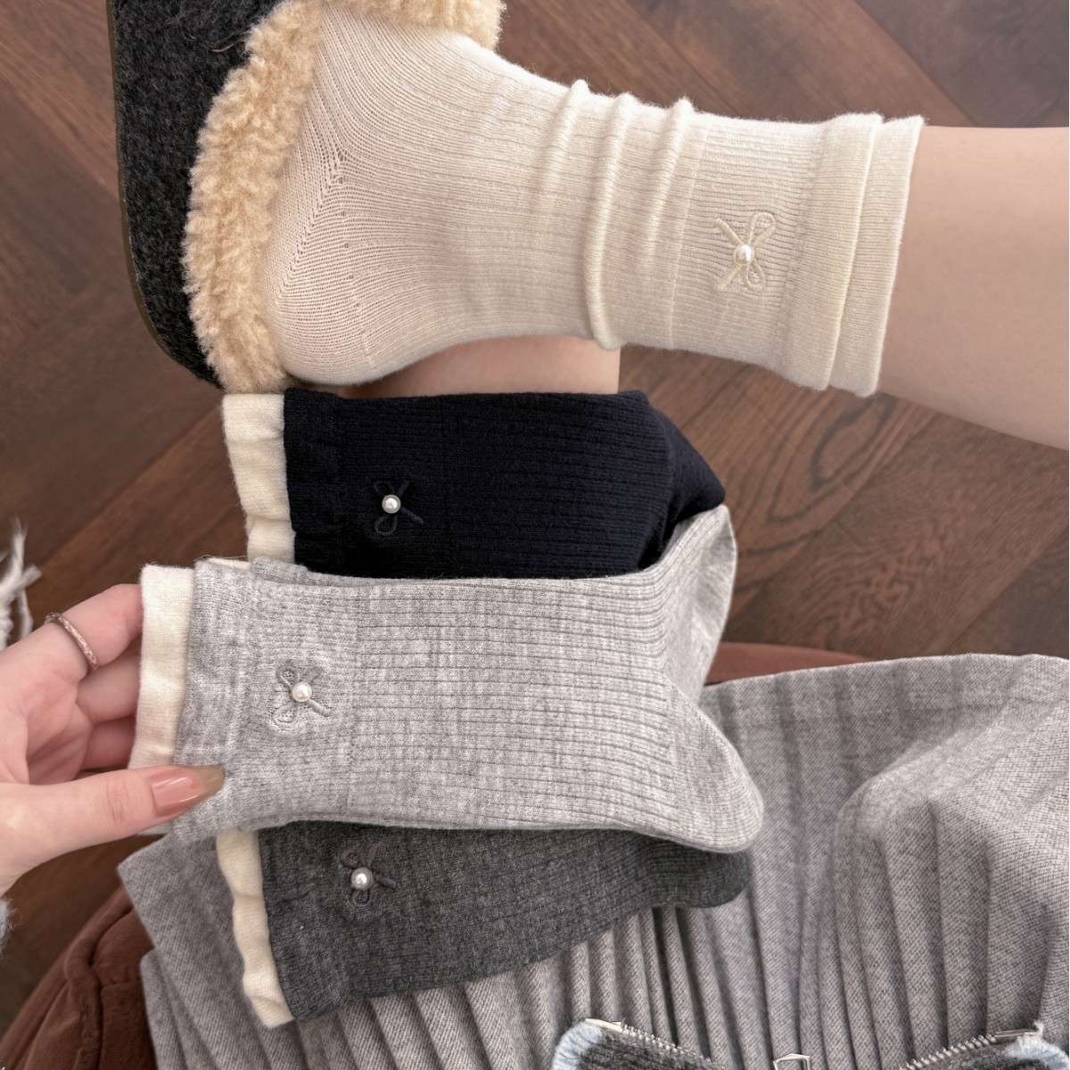 秋冬羊毛袜子女韩系双罗口撞色中筒袜ins珍珠蝴蝶结软糯长筒堆堆