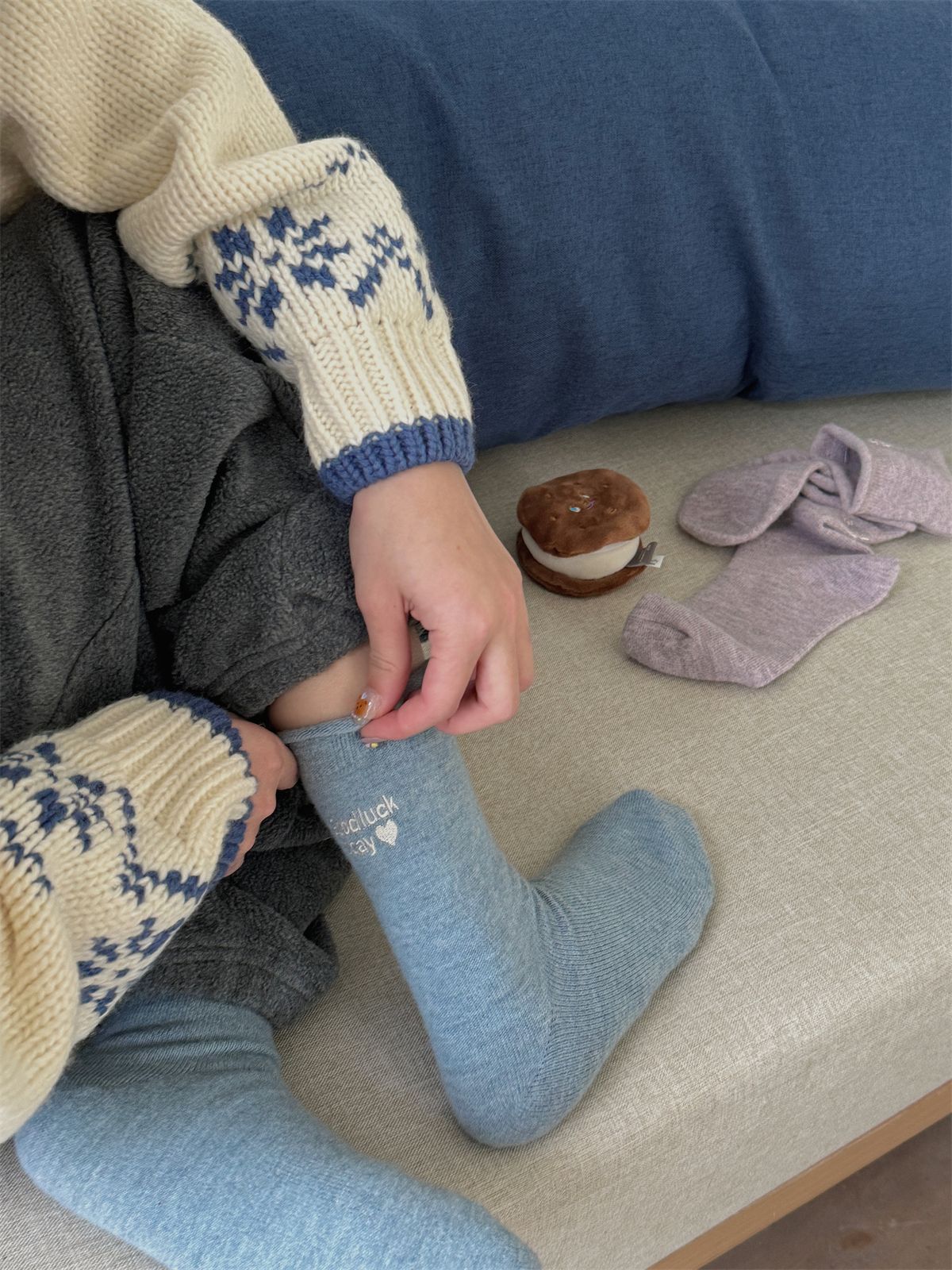 蓝灰系小众堆堆袜~韩版女袜双罗口带标条纹中筒袜秋冬纯棉袜子女