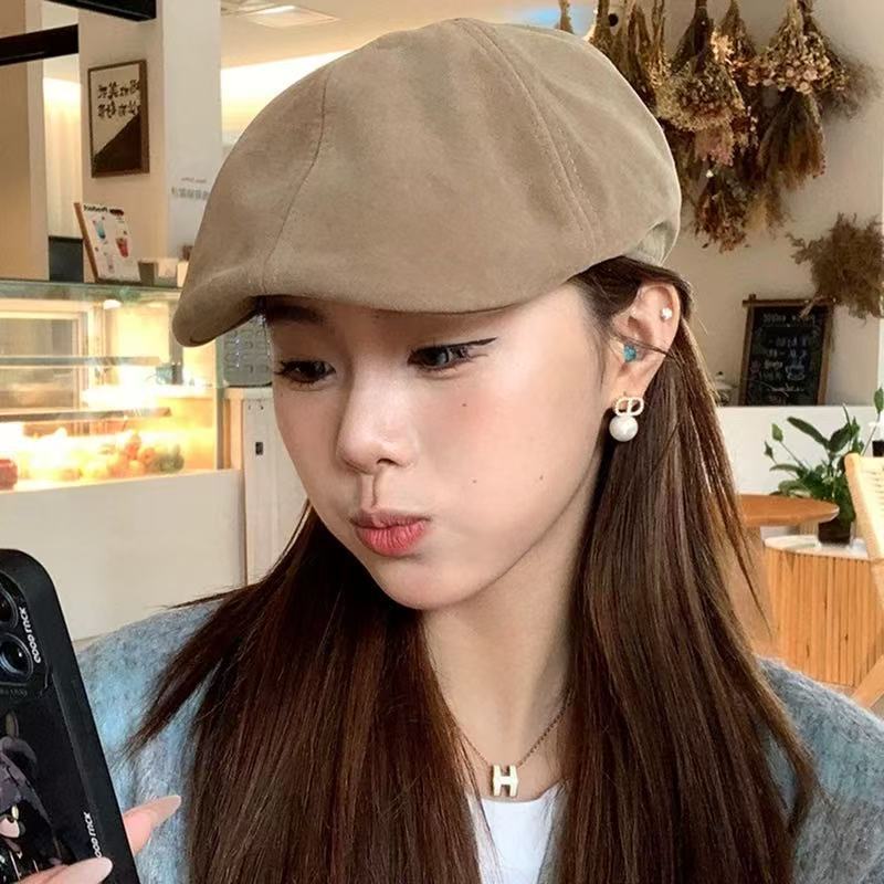 秋冬复古麂皮绒前进帽男女款纯色英伦风画家帽日系街头感报童帽子