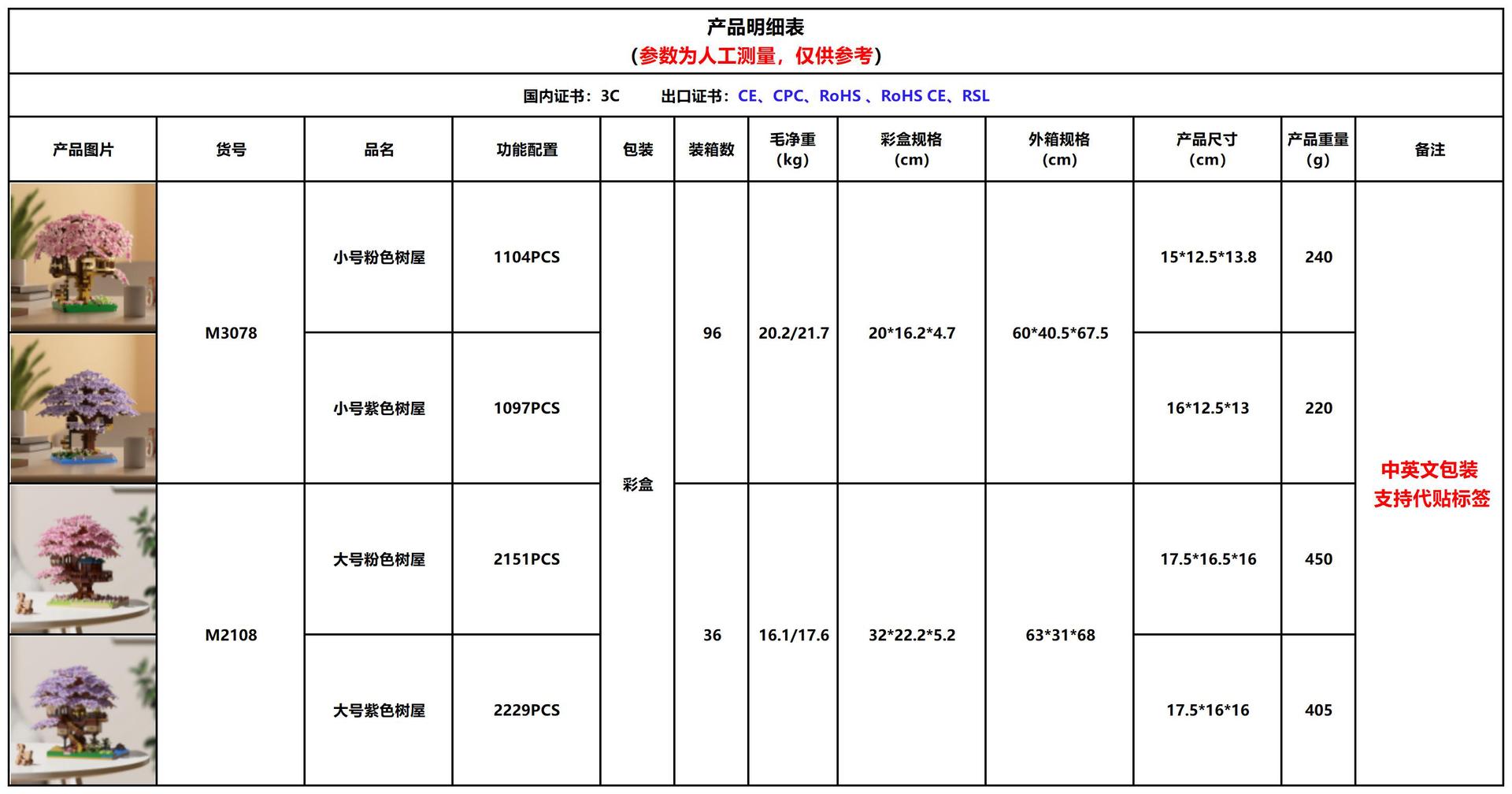 ラージピンクツリーハウス 2151PCS-M2109,ラージピンクツリーハウス 2151PCS+ライト M2109,ラージパープルツリーハウス 2229PCS-M2108,ラージパープルツリーハウス 2229PCS+ライト M2108,スモールピンクツリーハウス 1104PCS-M3079,スモールピンクツリーハウス 1104PCS+照明 M3079,スモールパープルツリーハウス 1097PCS-M3078,小さな紫色のツリーハウス 1097 個 + 照明 M3078