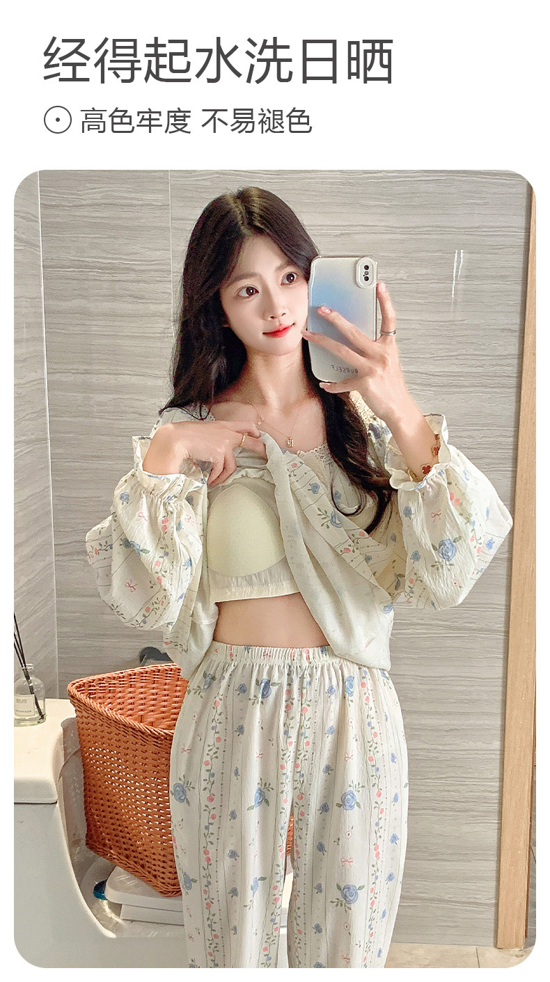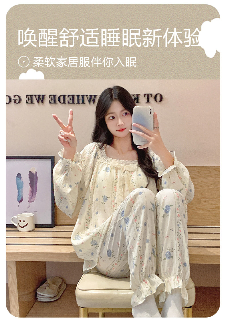 新しいパジャマの女性のスーツは胸のパッドの春と秋の王女の風の雲の綿の甘い長袖の部屋の服を持って外に着ることができます。