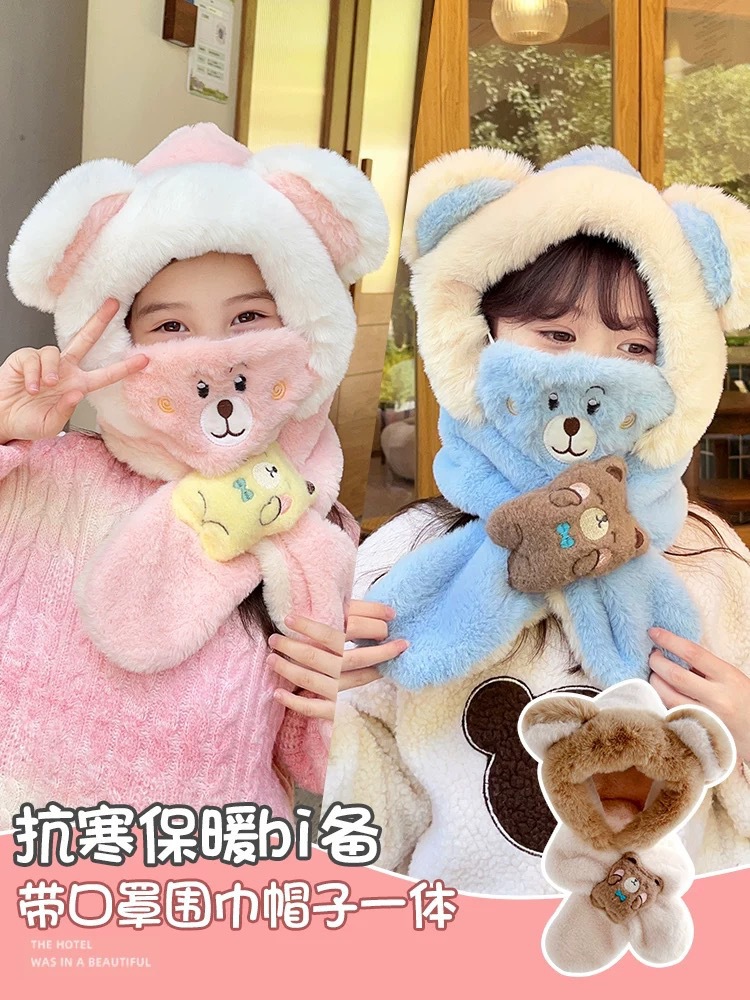 新款儿童帽子围巾一体冬季可爱超萌加厚保暖宝宝毛绒帽护耳帽批发