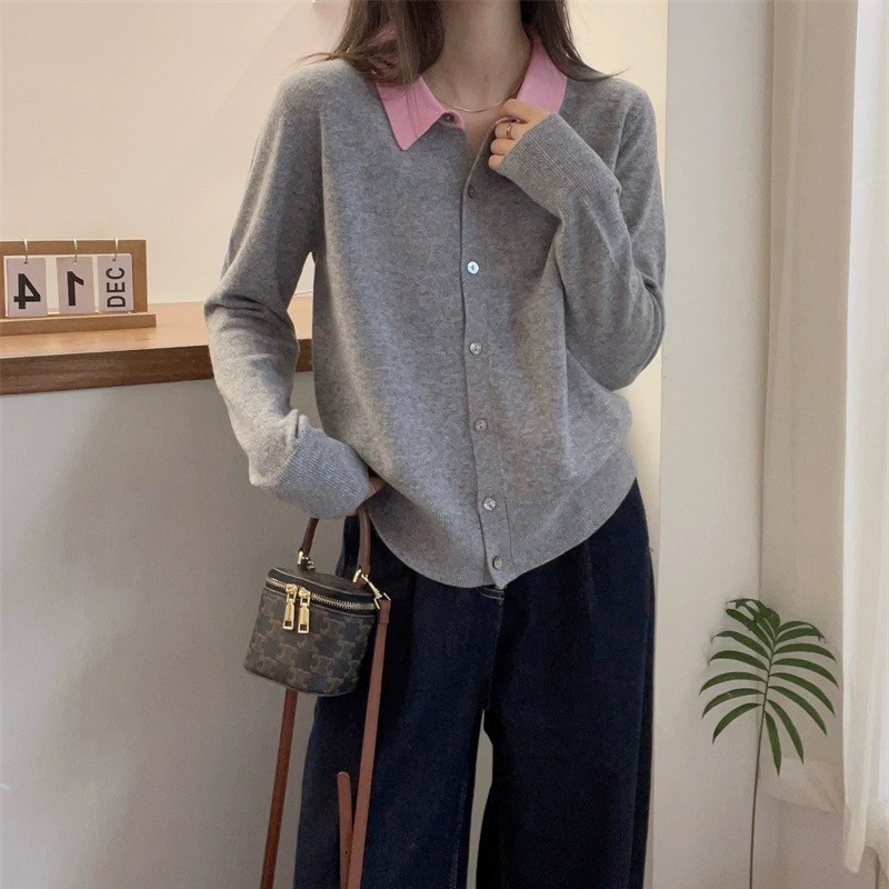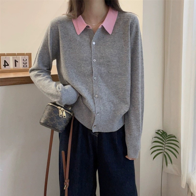 ファッションのゆったりとしたショートタイプの衝突色POLO襟ウールのニットカーディガンの女性の毛の色合わせのシャツの襟の韓国版のセーターのコート