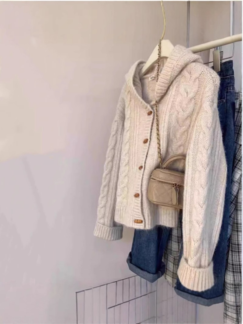 韩系加厚麻花牛角扣羊毛衫外套女秋冬25新款羊毛开衫慵懒连帽上衣
