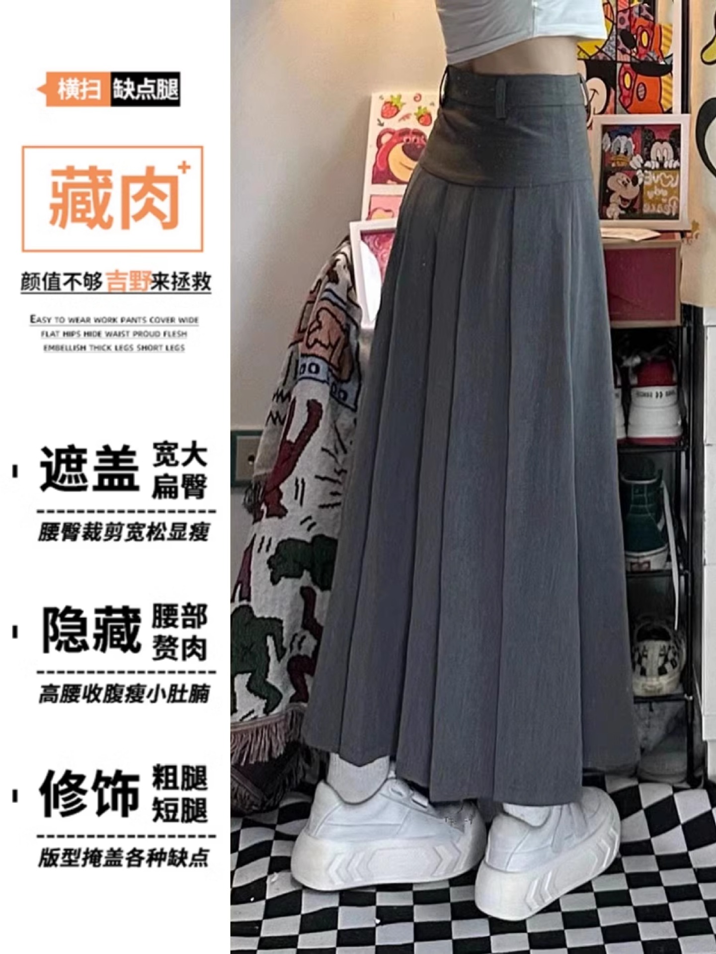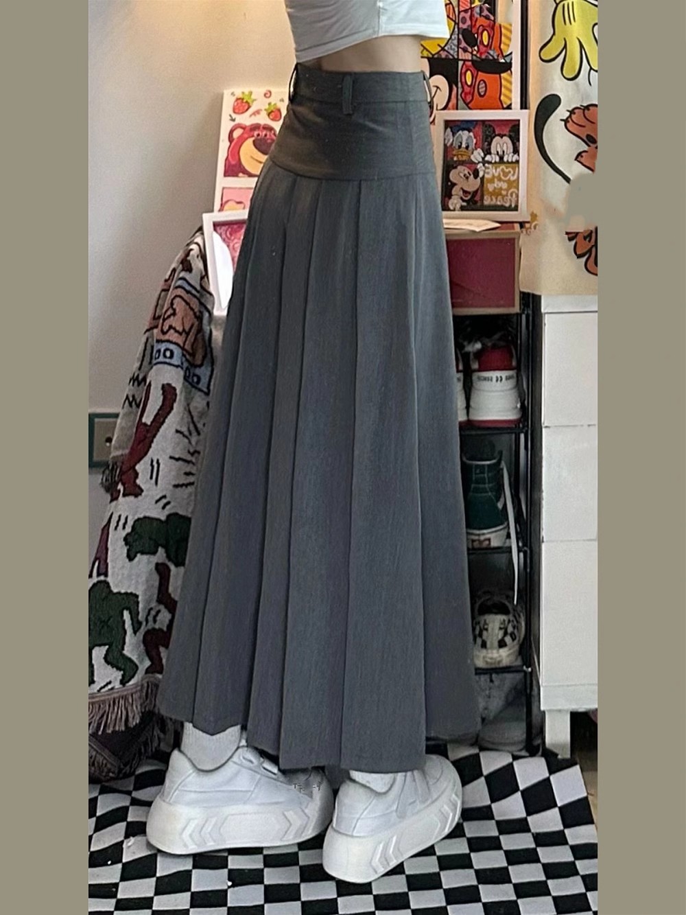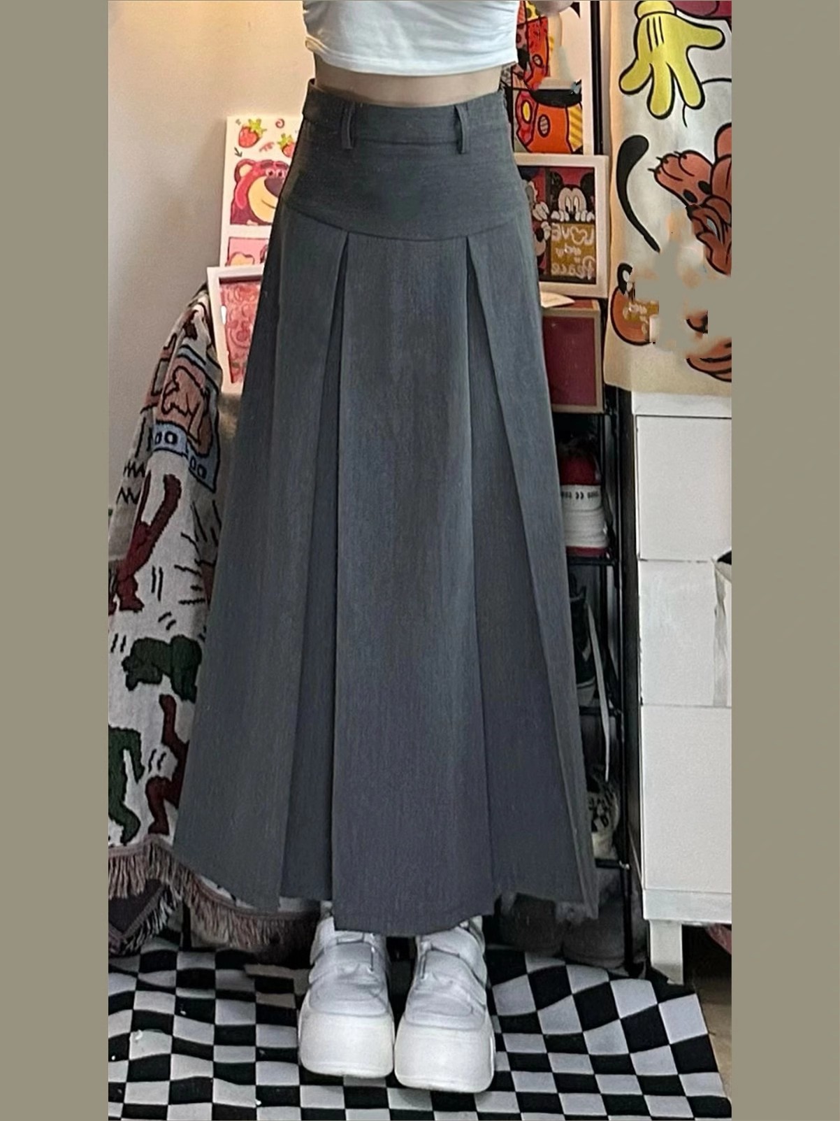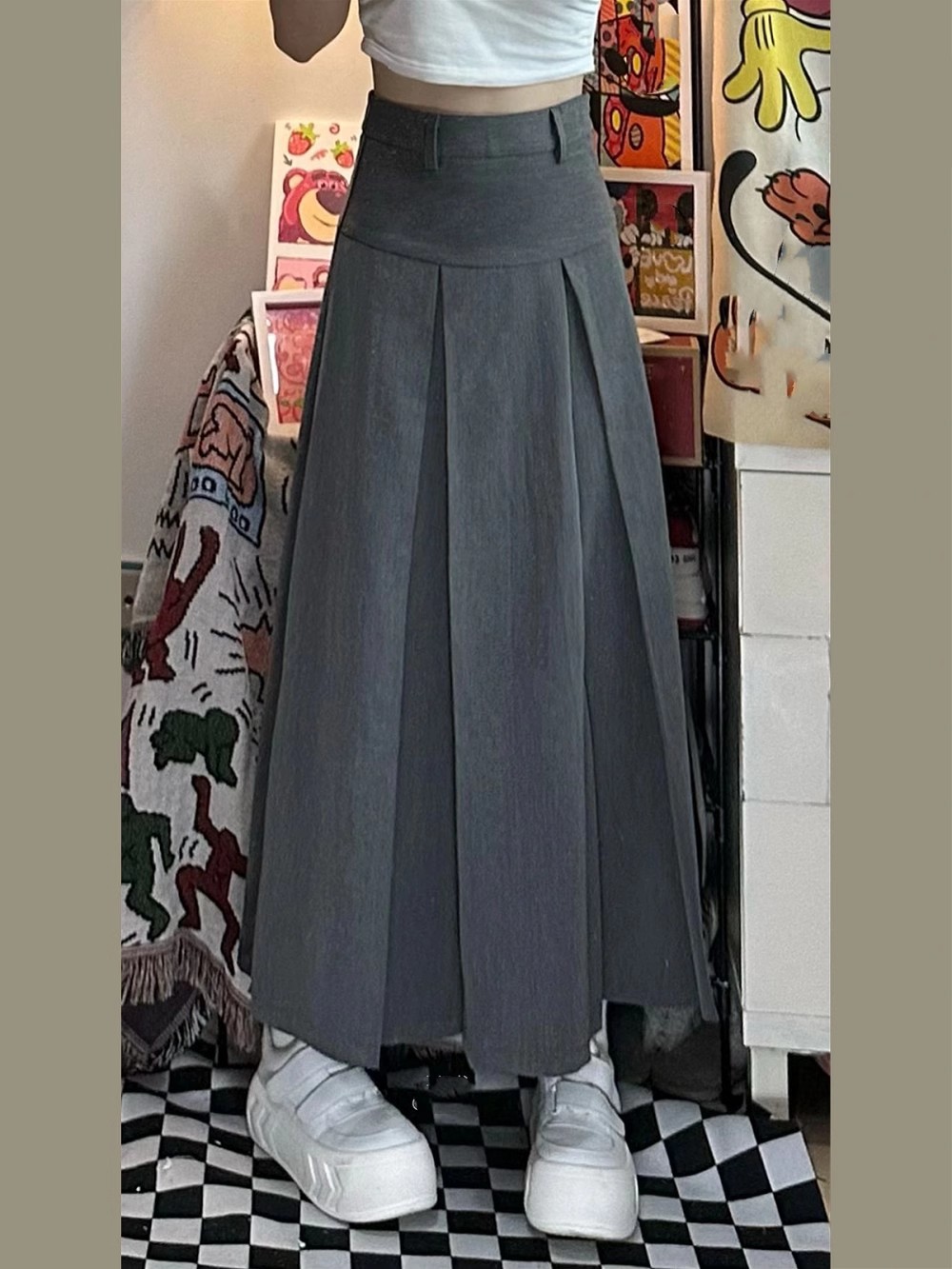 グレーのAラインスーツ、ハイウエストプリーツロングスカート、秋の新作、ぽっちゃりさん向け、大きいサイズ、ドレープ感があり、ヒップをカバーしてスリムに見せるスカート
