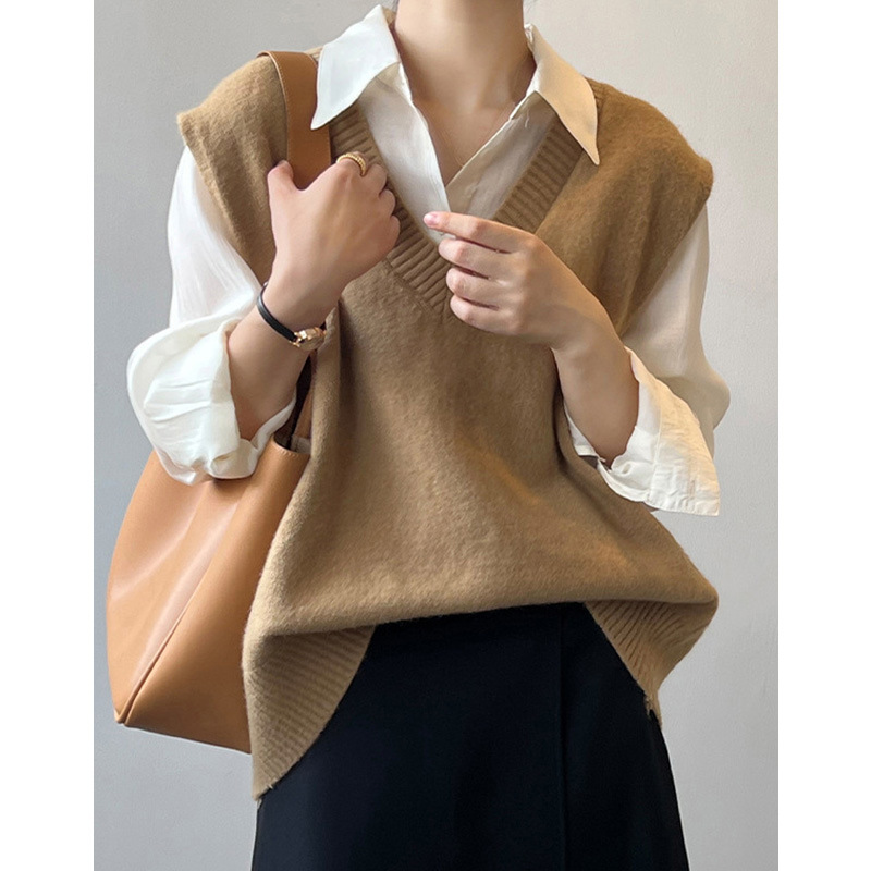 Vネックニットベスト レディース 2025秋 ゆったりカジュアルセーターベスト インナー重ね着トップス エレガントで着痩せ効果あり