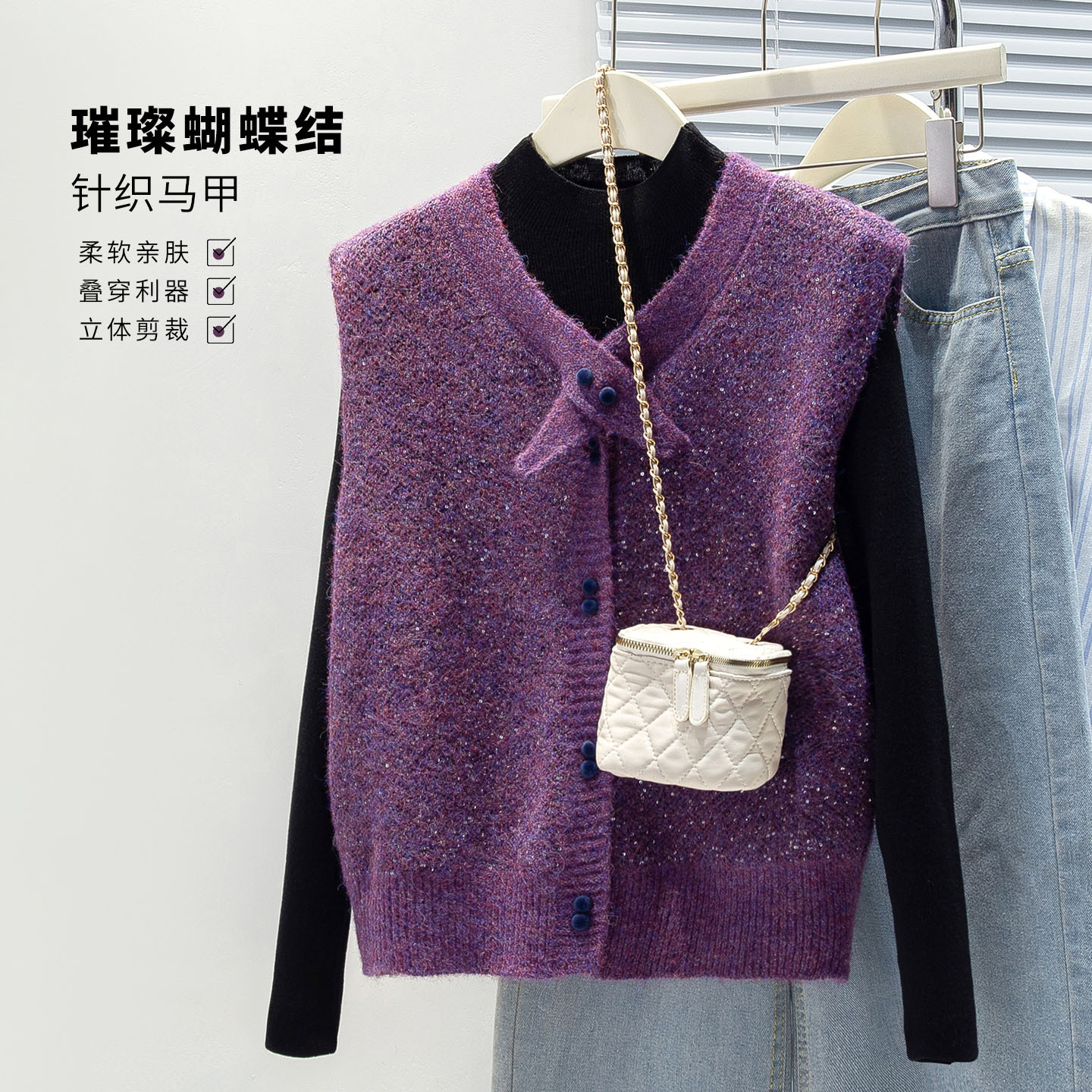 棉茧 蝴蝶领亮闪闪马甲女韩版2025年秋冬新款针织坎肩时髦叠穿款