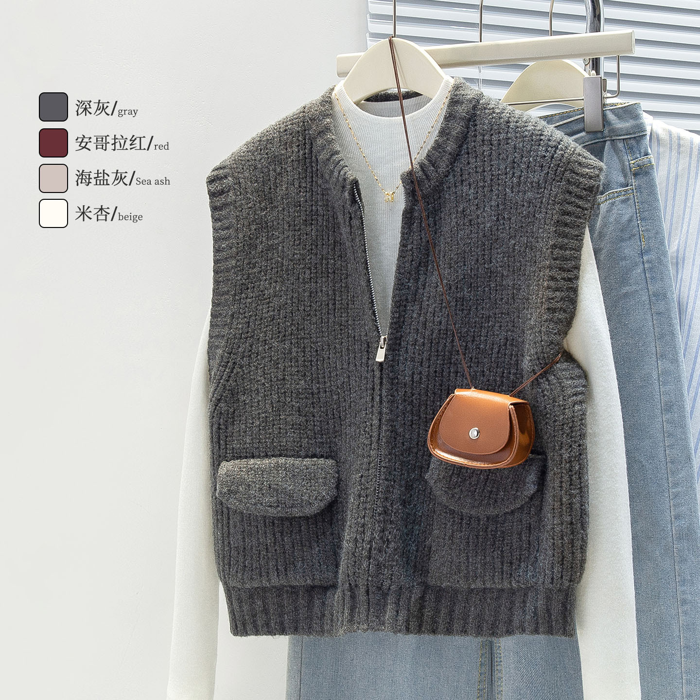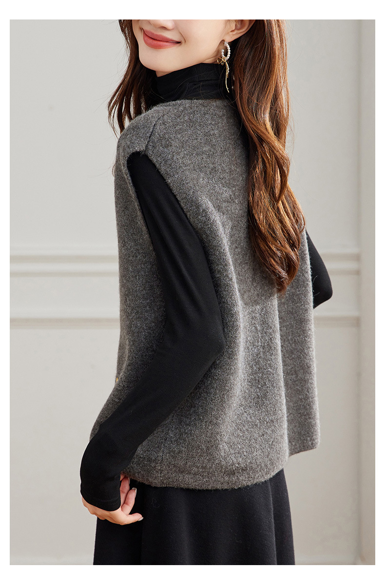棉茧 粗针针织马甲女秋冬款慵懒韩系风翻盖双口袋拉链开衫坎肩