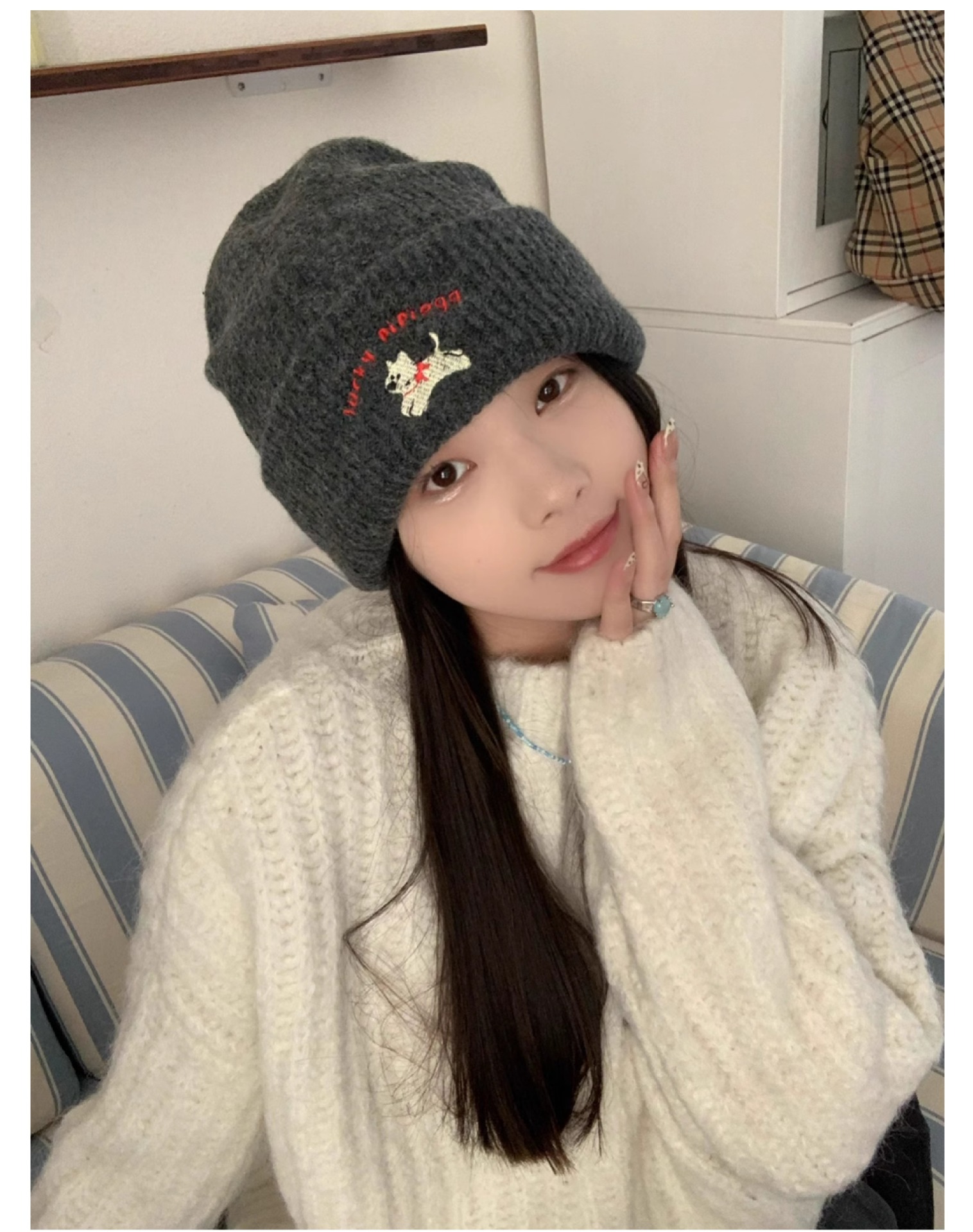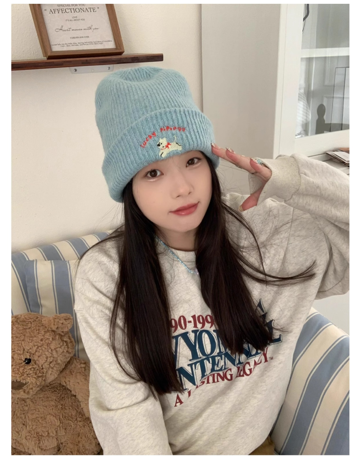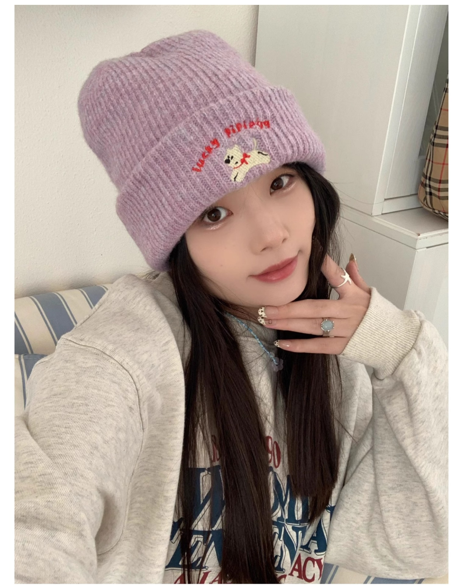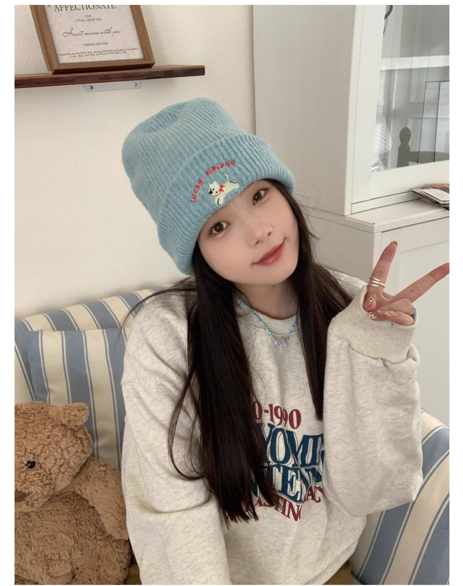 子犬の刺繍の韓国版の百合ニットの毛糸の帽子は顔の小さい保温の耳の秋冬の包頭の帽子の女性の卸売りを現します。