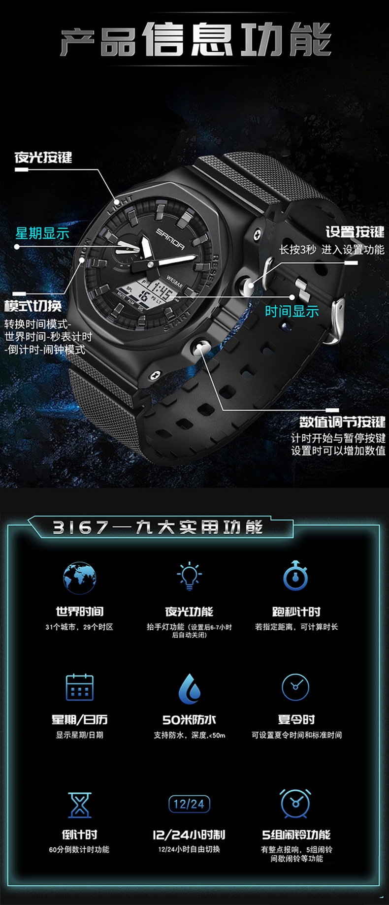 アウトドア登山スポーツ腕時計炭素繊維防水ストップウォッチカウントダウン目覚まし時計学生電子時計夜光丸時計男