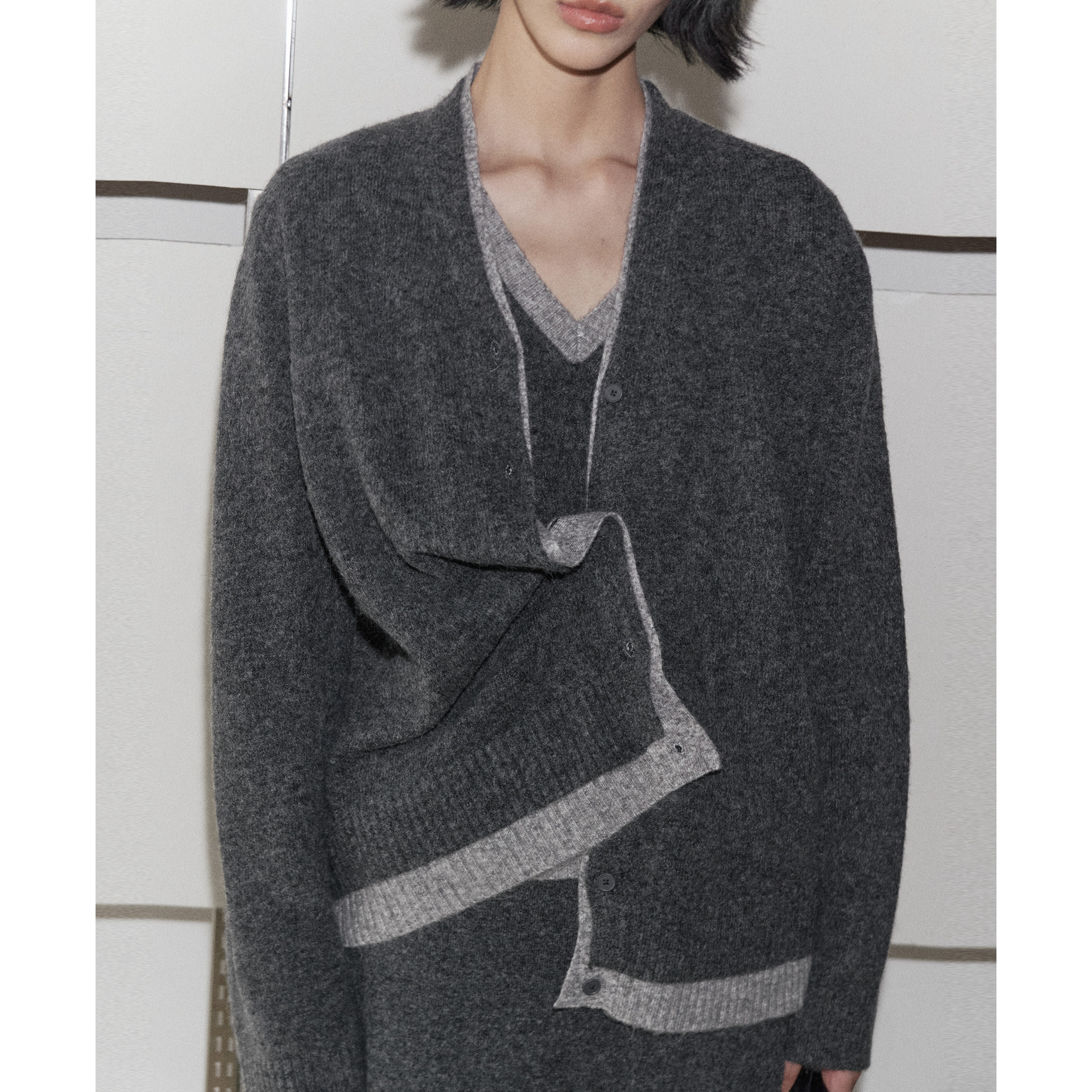 UNITY MODE miuシリーズ コントラストカラーVネックウールセーター レディース 秋冬 重ね着 グレー ニット ソフトで柔らかいトップス