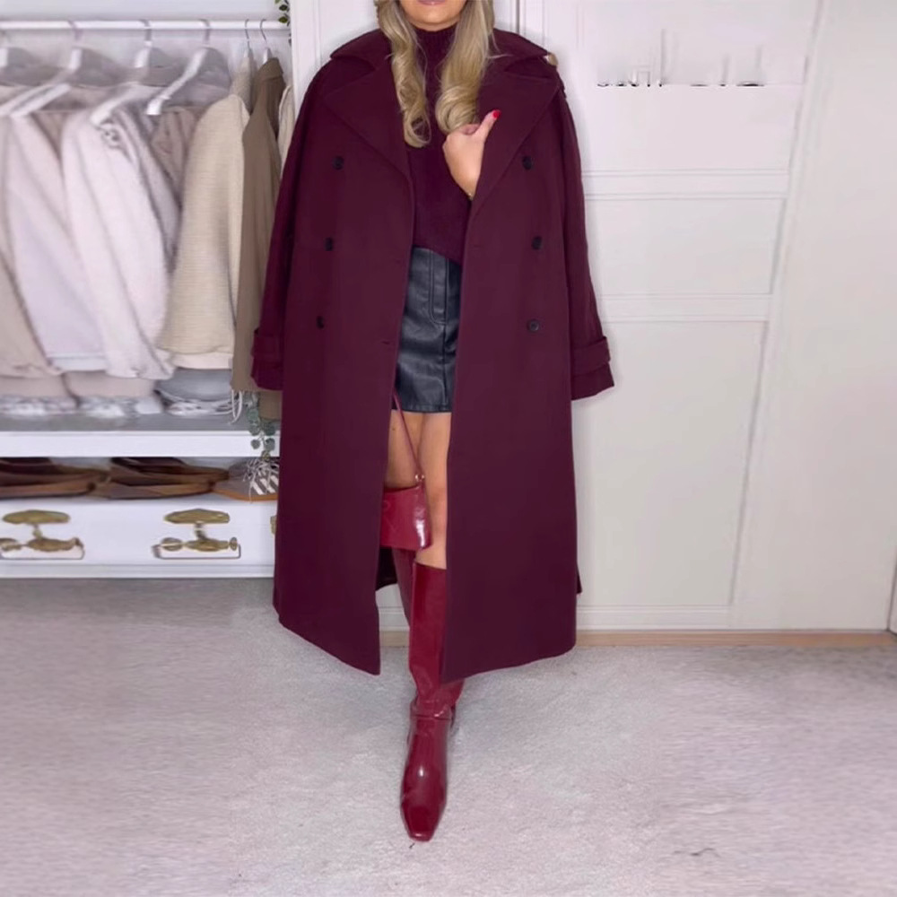 在庫あり、ヨーロッパとアメリカの秋冬レディースレトロルーズ長袖ベルト付きダブルブレストウインドブレーカージャケット
