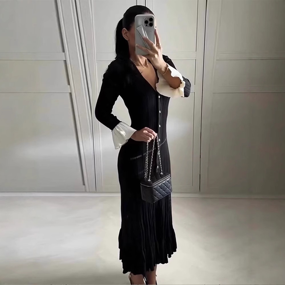 フレンチスプライス袖口コントラストカラーシングルブレストVネックロングドレス2025春夏新作レディースクロスボーダーヨーロッパとアメリカンスタイル