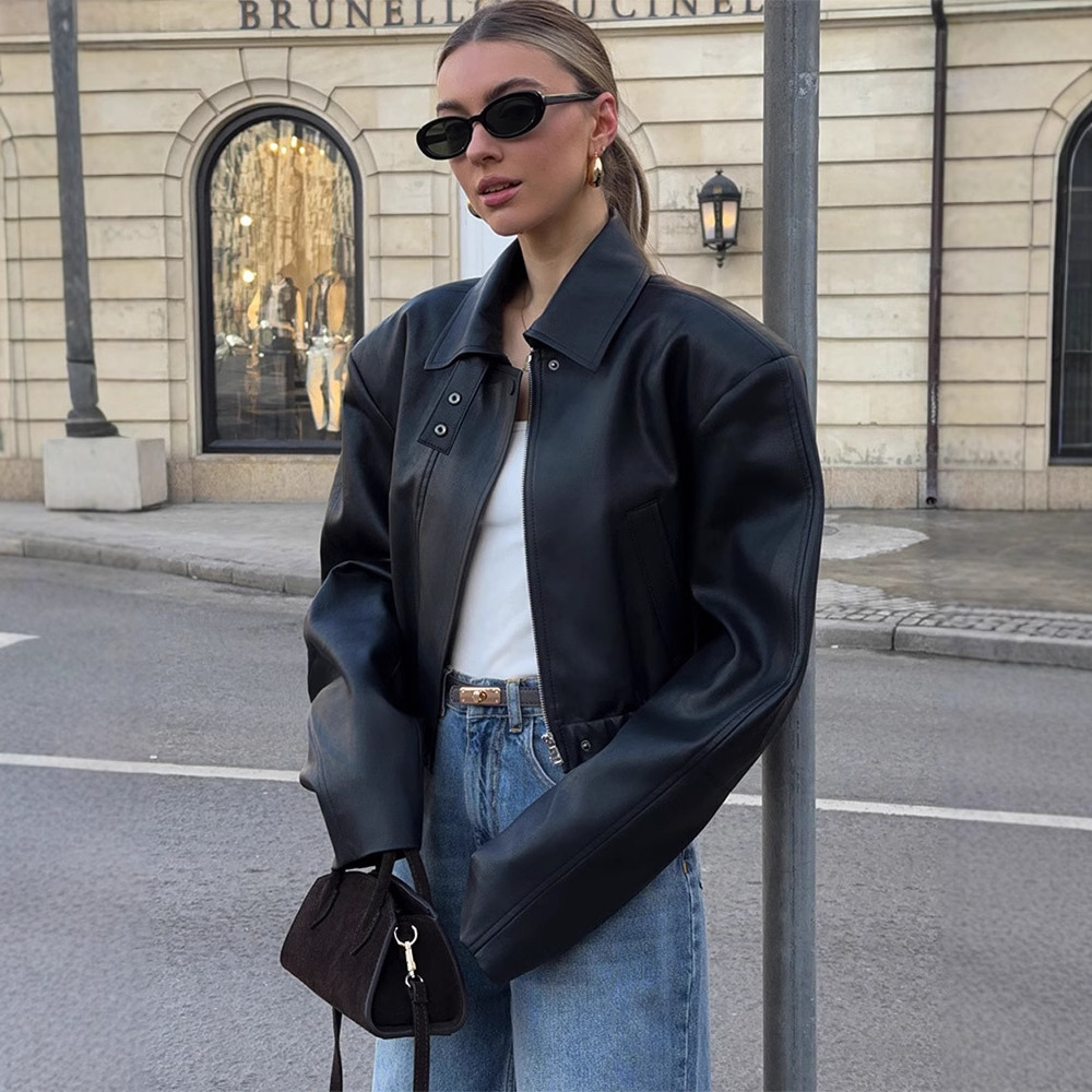 シンプルでファッション的な純色の襟付きジッパー付き革ジャンプカジュアルコート女性2025春の新型アマゾンが人気がある