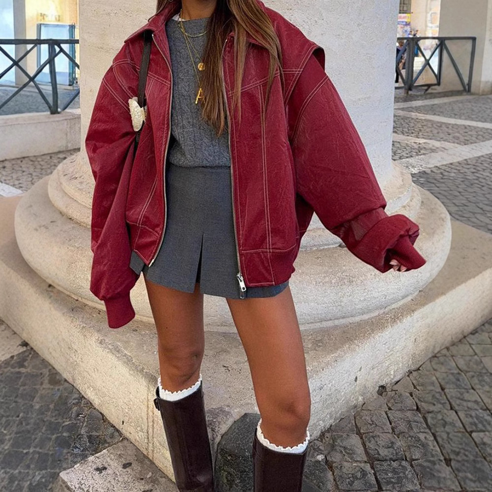 ファッションカジュアルルーズソリッドラペルレザーコートジャケット 2025 春の新作 AliExpress ホット販売女性の卸売
