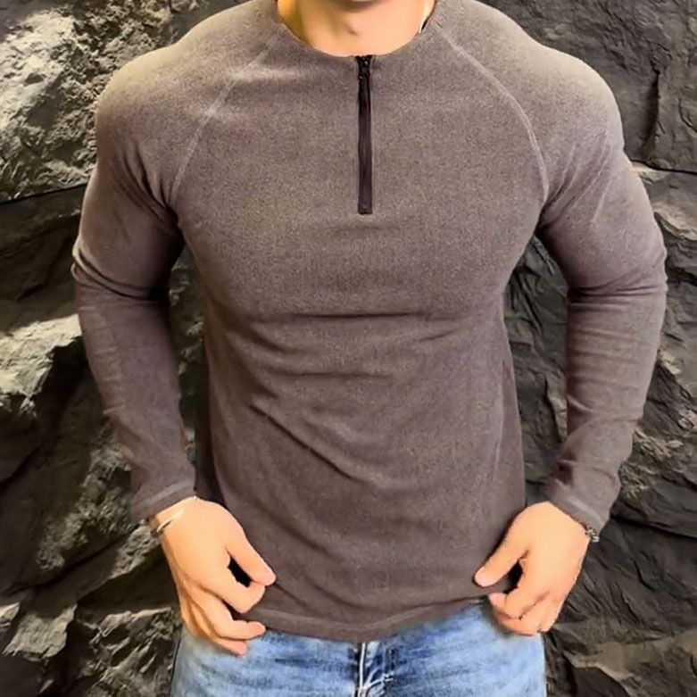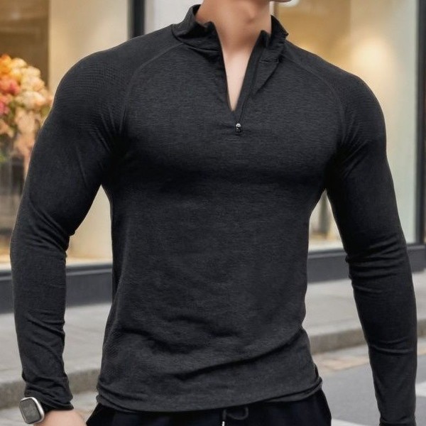 秋冬の修身保温半高襟ファスナー運動フィットネスシャツtシャツ男徳絨顕大長袖
