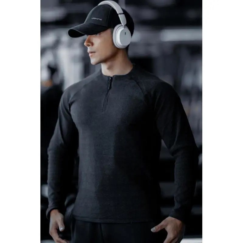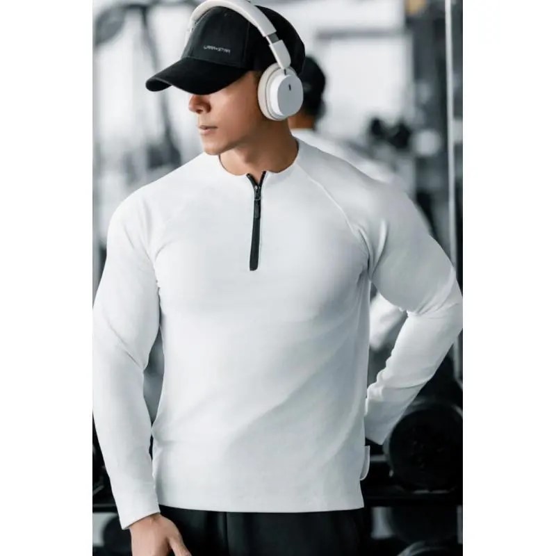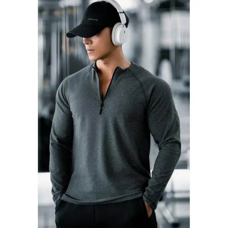 秋冬用厚手両面デロン素材保温フィットネスジッパー/レトロポロ襟スポーツ高伸縮性ベースレイヤー長袖Tシャツ