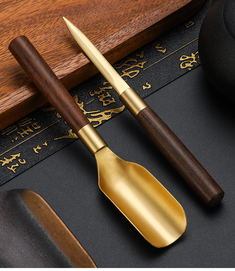 銅の木の茶は実木の純粋な黄銅を挟んで茶道の六君子の茶器の部品の大全の茶の刀のペンを結び付けてスプーンを挟んでお茶を入れます。