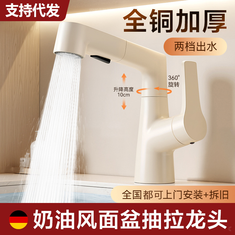 新款奶油风白色精铜洗脸盆水龙头冷热两用抽拉式洗漱台面盆浴室柜